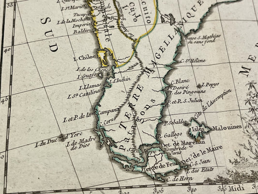 Small antique map of Chile, Paraguay and Magellanic Land by Robert de Vaugondy - ca. 1770
