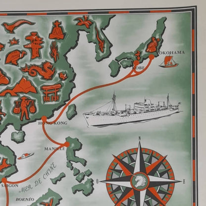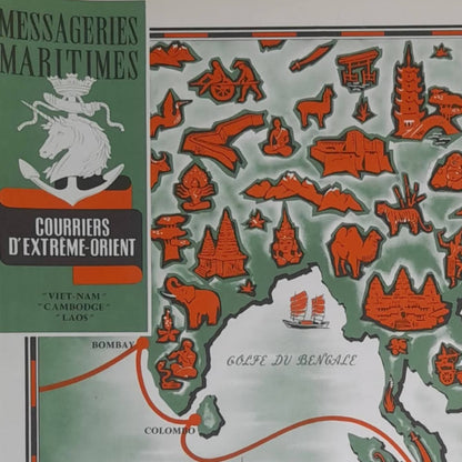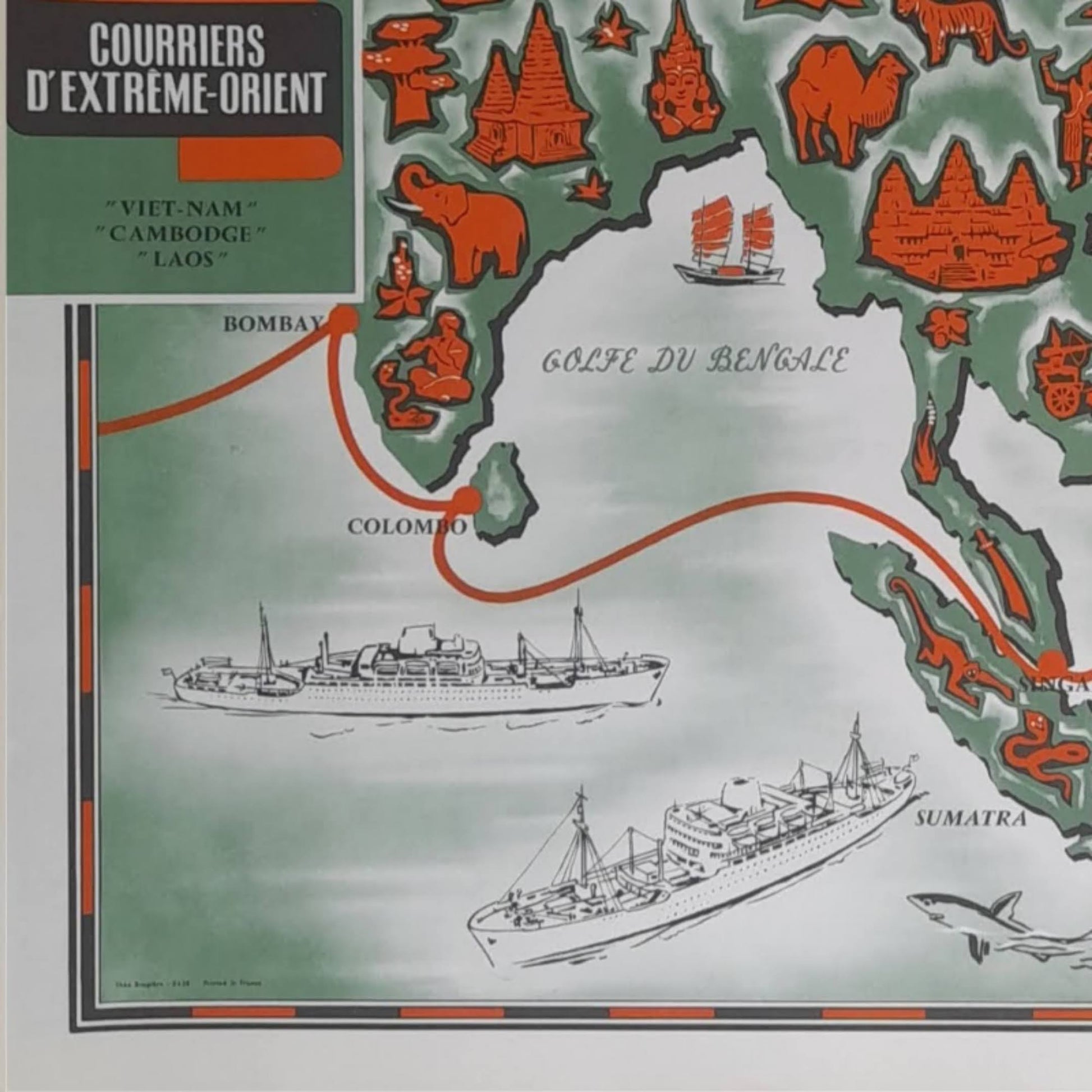 This 1950 Messageries Maritimes poster illustrates the company's shipping routes in the Indian Ocean and Southeast Asian regions. The map is richly decorated with stylized illustrations of the various islands and destinations served by Messageries Maritimes. The shipping routes are highlighted by red lines, connecting major ports and exotic destinations. The poster showcases iconic locations such as Bombay, the Bay of Bengal, Colombo, Singapore, Hong Kong, and other Southeast Asian islands, with artistic designs that capture the essence of these far-flung regions. Ships are also illustrated, symbolizing the company's voyages and maritime connections. This poster is an advertising piece that combines both an informative function and visual appeal, typical of travel posters of the time. Dimensions: 56*76 cm