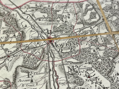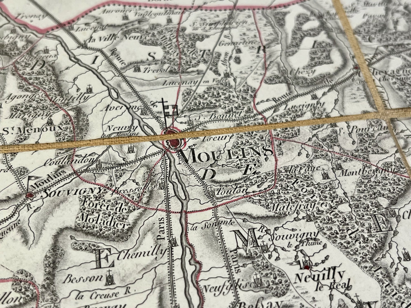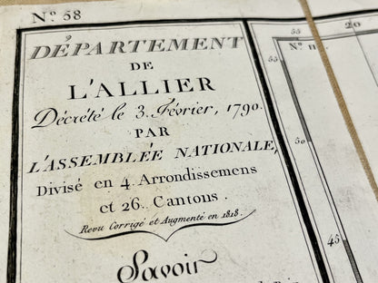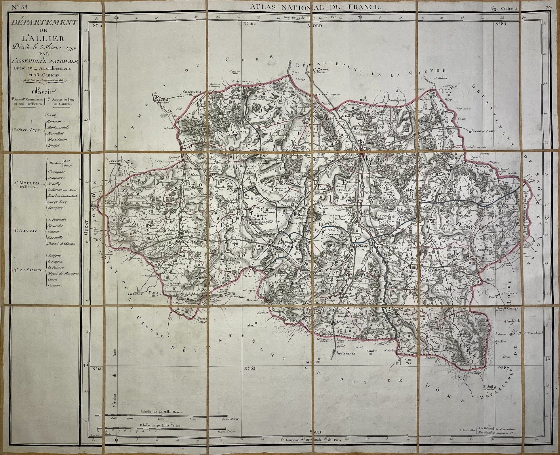 This antique map of the Allier department is canvas-backed and was created by the French geographer Pierre-Gilles Chanlaire in the early 19th century. It is from the Atlas National de France and measures 66.5x54cm.