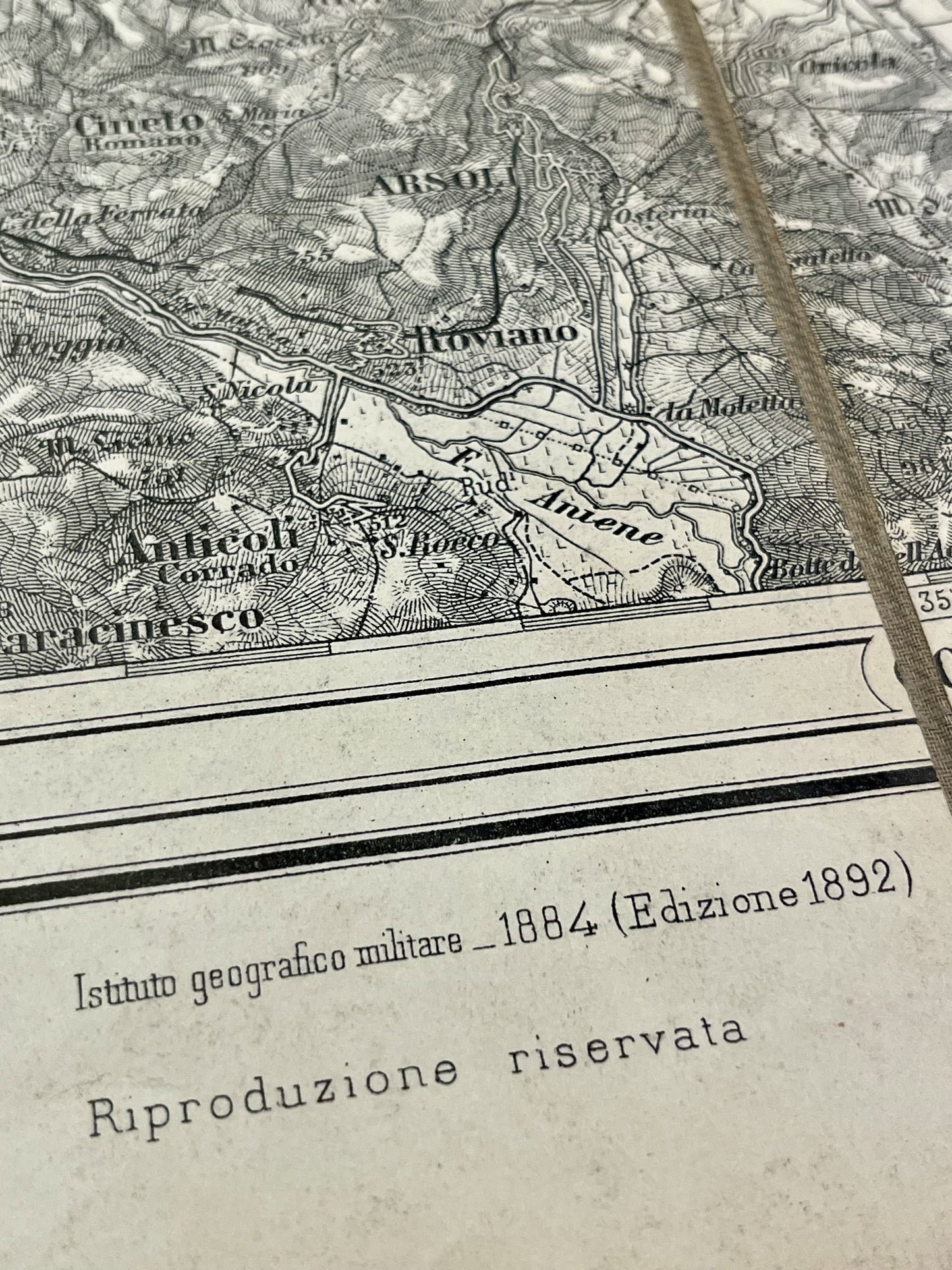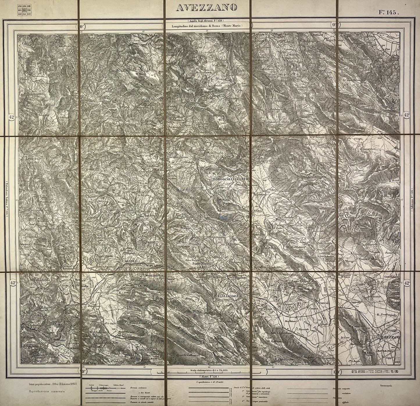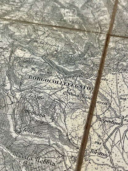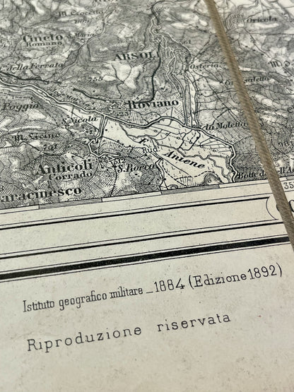 This antique map of Italy depicts the area around Avezzano. It was published by the Instituto Geografico Militare in 1892. It is linen-backed and measures 63x61cm.