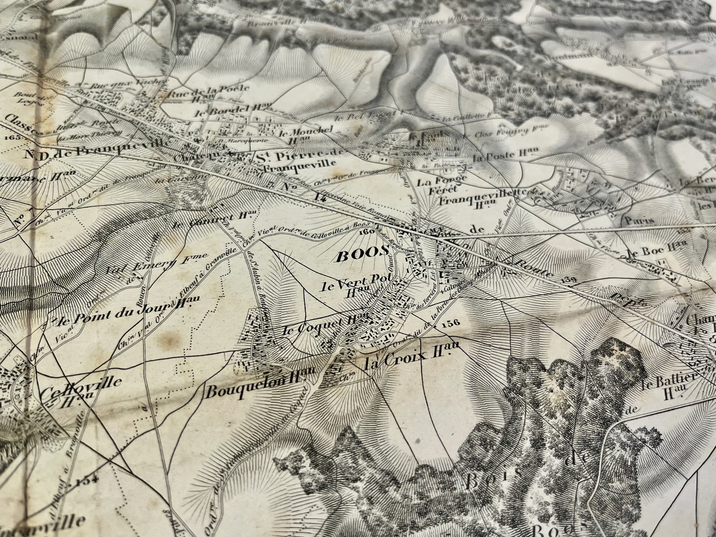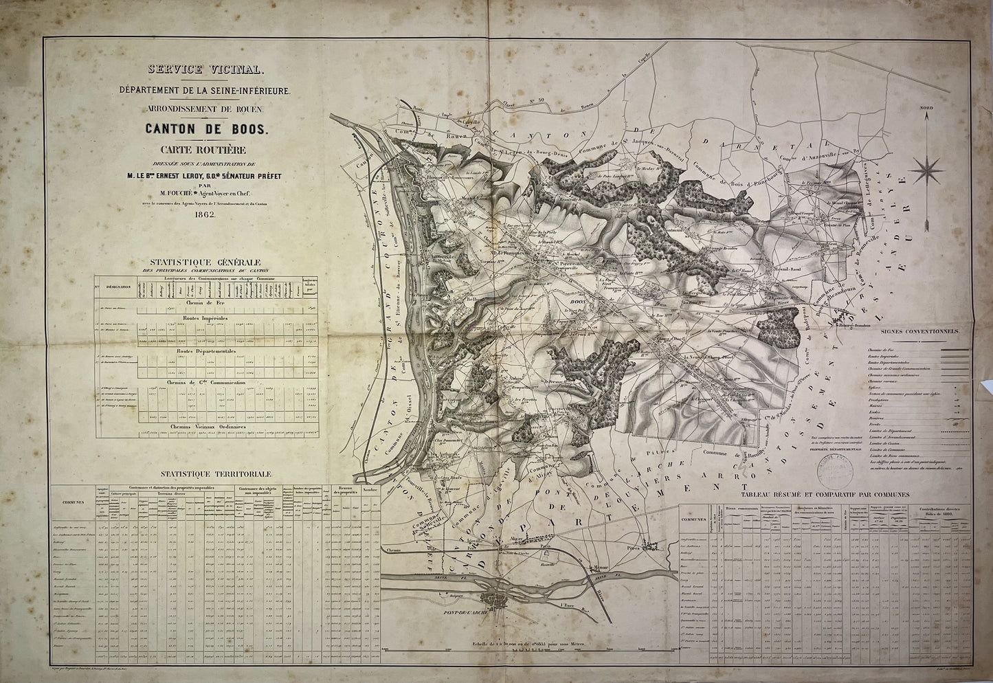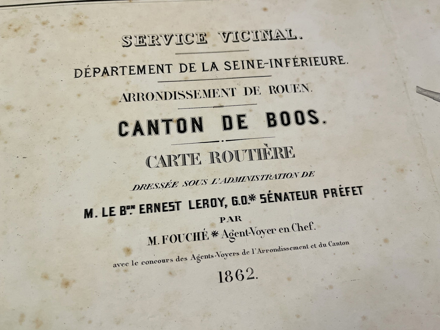This antique road map of the Canton of Boos, Seine-Maritime, was drawn up under the Administration of Baron Ernest Leroy, Senator Prefect of Seine-Inférieure. It is dated 1862 (date of production, no print) and its size is 105x74.5cm.