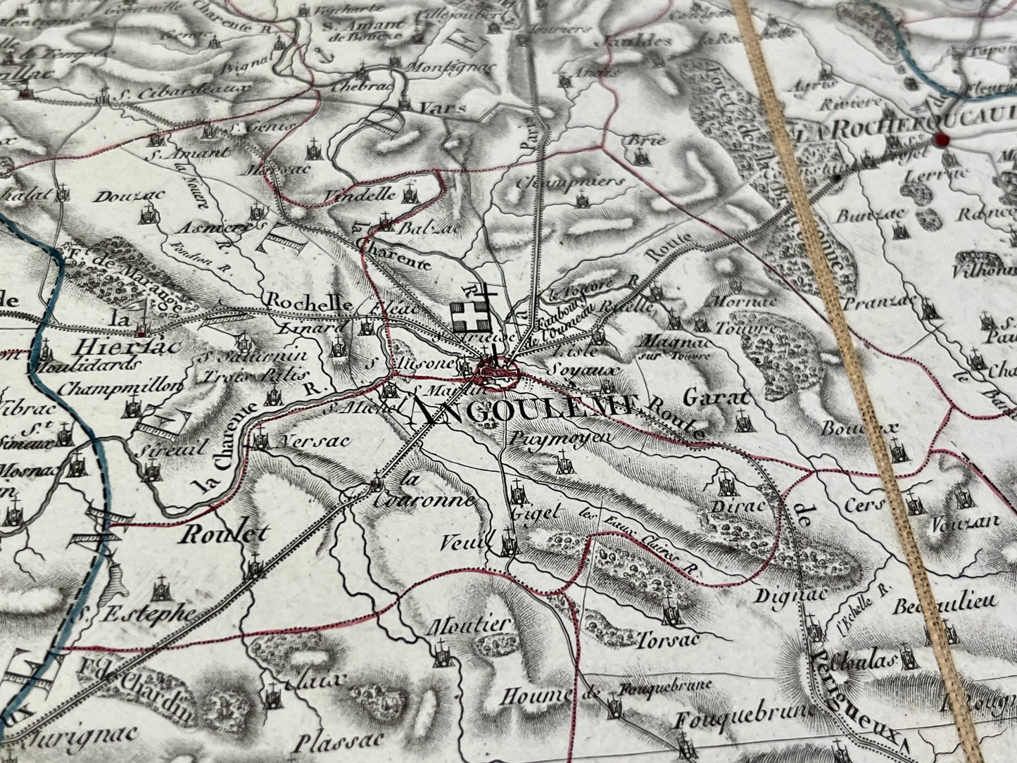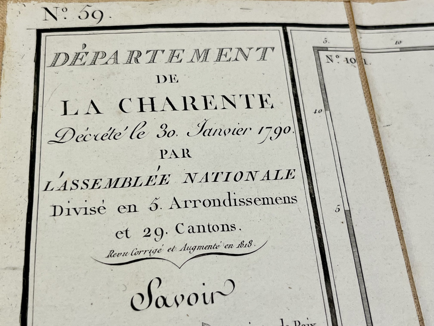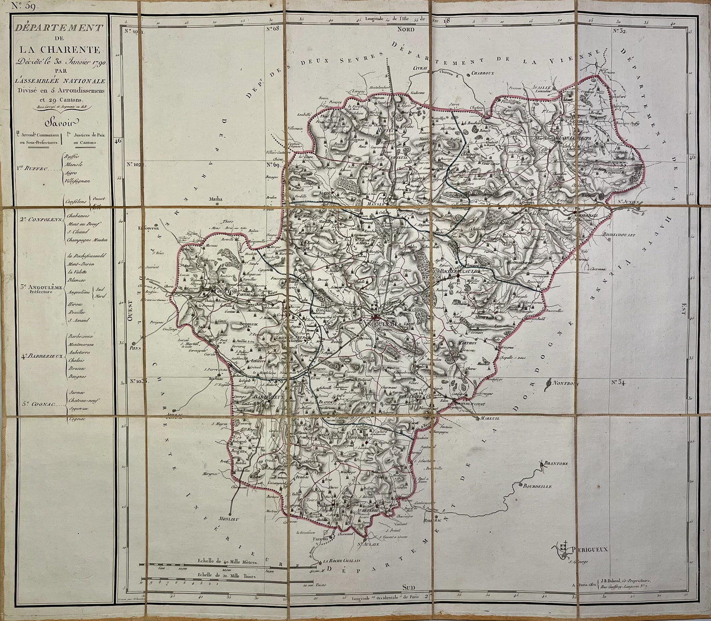 This antique map of the Charente department is canvas-backed and was created by the French geographer Pierre-Gilles Chanlaire in the early 19th century. It is from the Atlas National de France and measures 62x54cm.