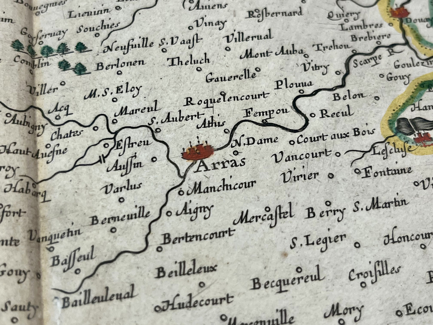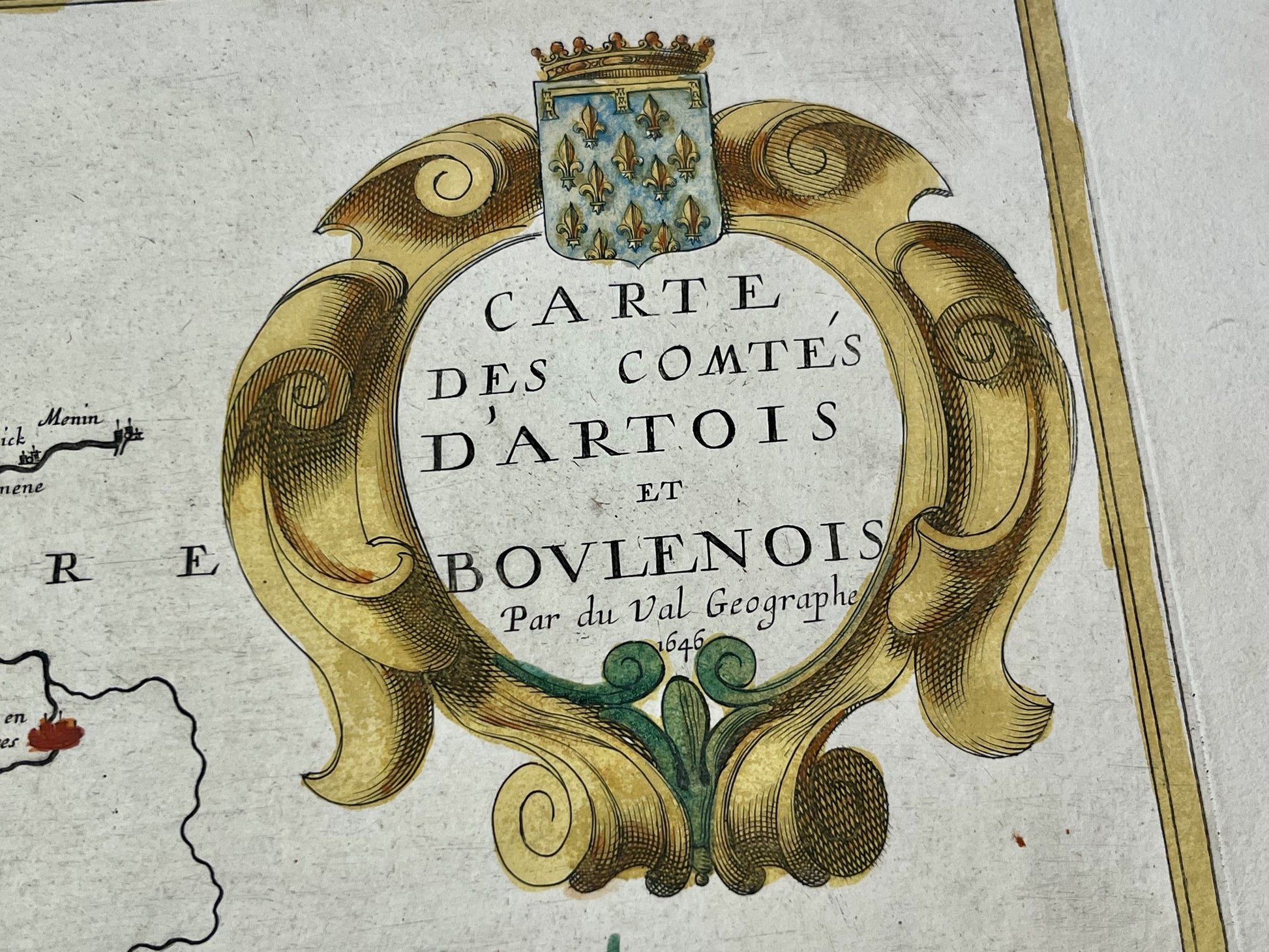 This antique map of Pas-de-Calais, depicting the counties of Artois and Boulonnais, dates from 1646 and measures 59x42.5cm. It was created by French cartographer Pierre Duval.