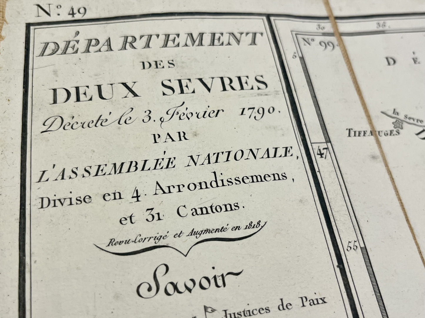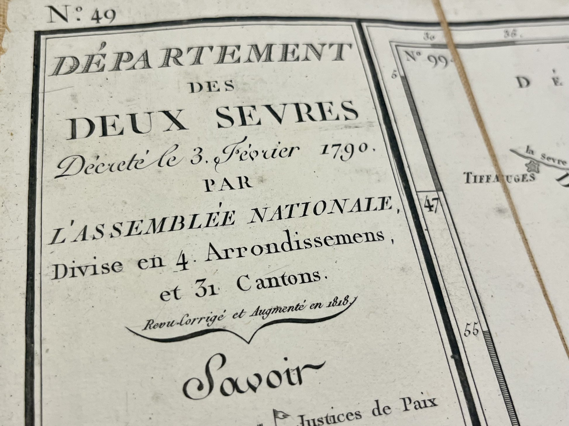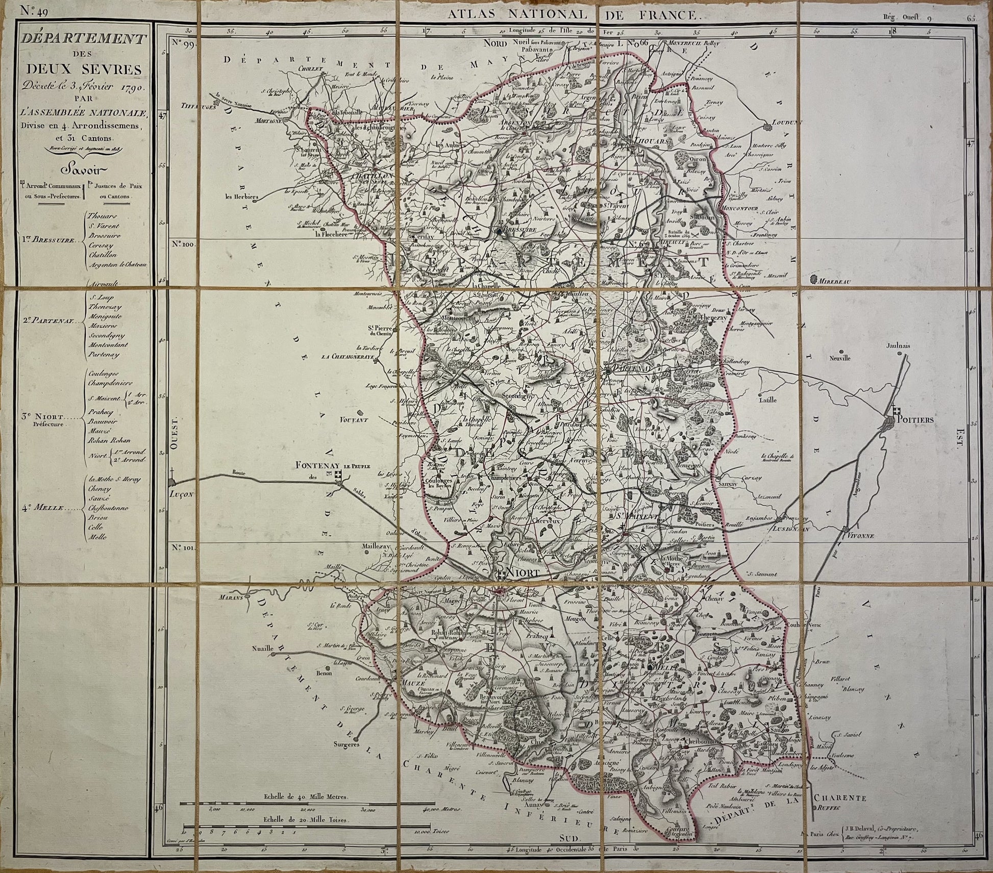 This antique map of the Deux-Sèvres department is canvas-backed and was created by the French geographer Pierre-Gilles Chanlaire in the early 19th century. It is from the Atlas National de France and measures 62x54cm.