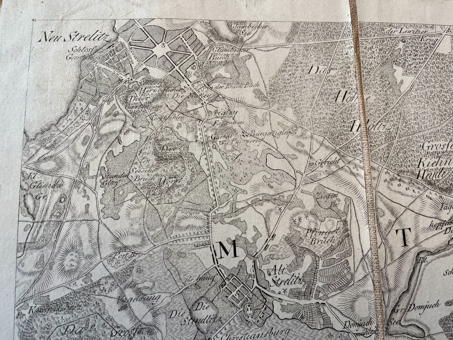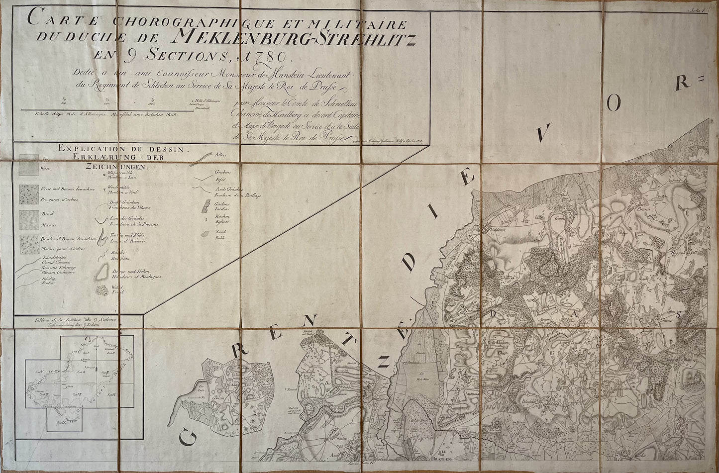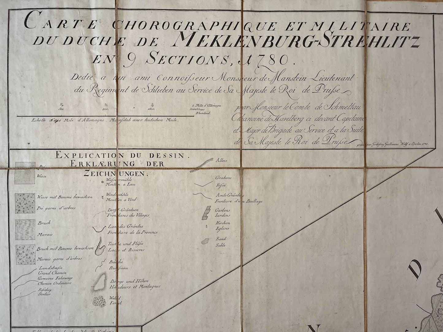 This magnificent set of 9 canvas maps representing the Duchy of Meklenburg-Strehlitz is dated 1780 and was "Dédié à un ami connoisseur Monsieur de Manstein, Lieutenant du Régiment de Schlieben au Service de Sa Majesté le Roi de Prusse". The dimensions of each map are 95.5x62.5cm.