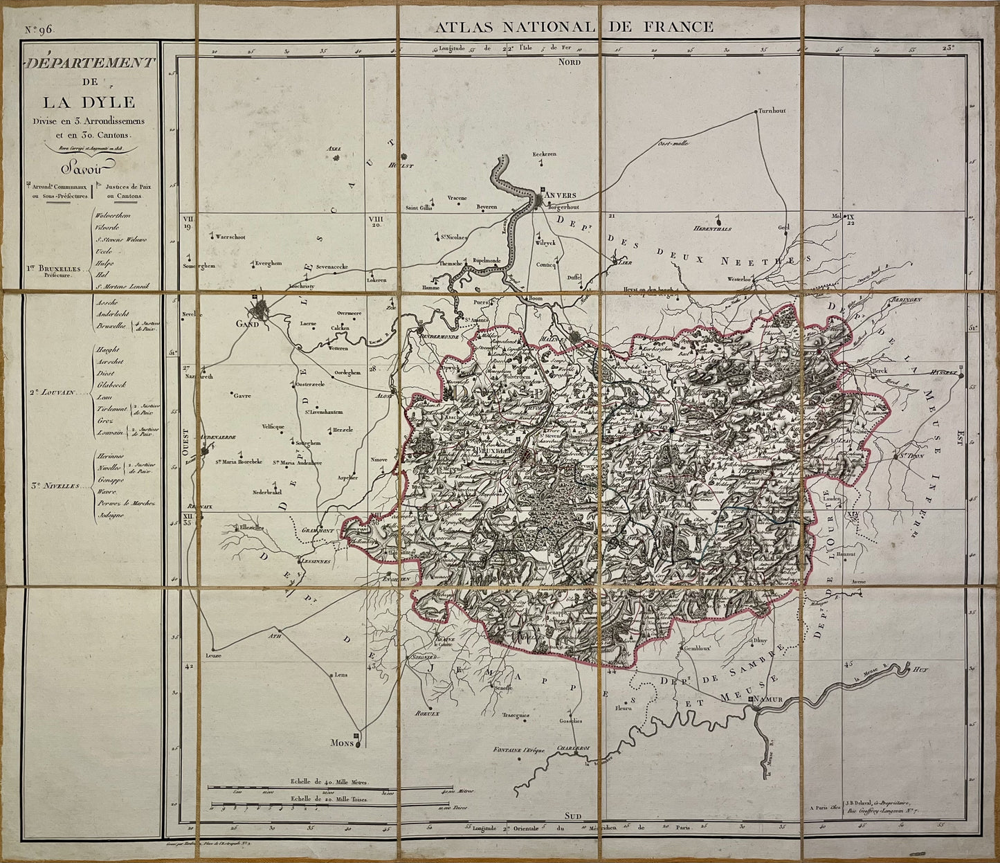This antique map of Belgium, depicting the First Empire department of Dyle, is canvas-backed and was created by the French geographer Pierre-Gilles Chanlaire in the early 19th century. It is from the Atlas National de France and measures 62x53.5cm.