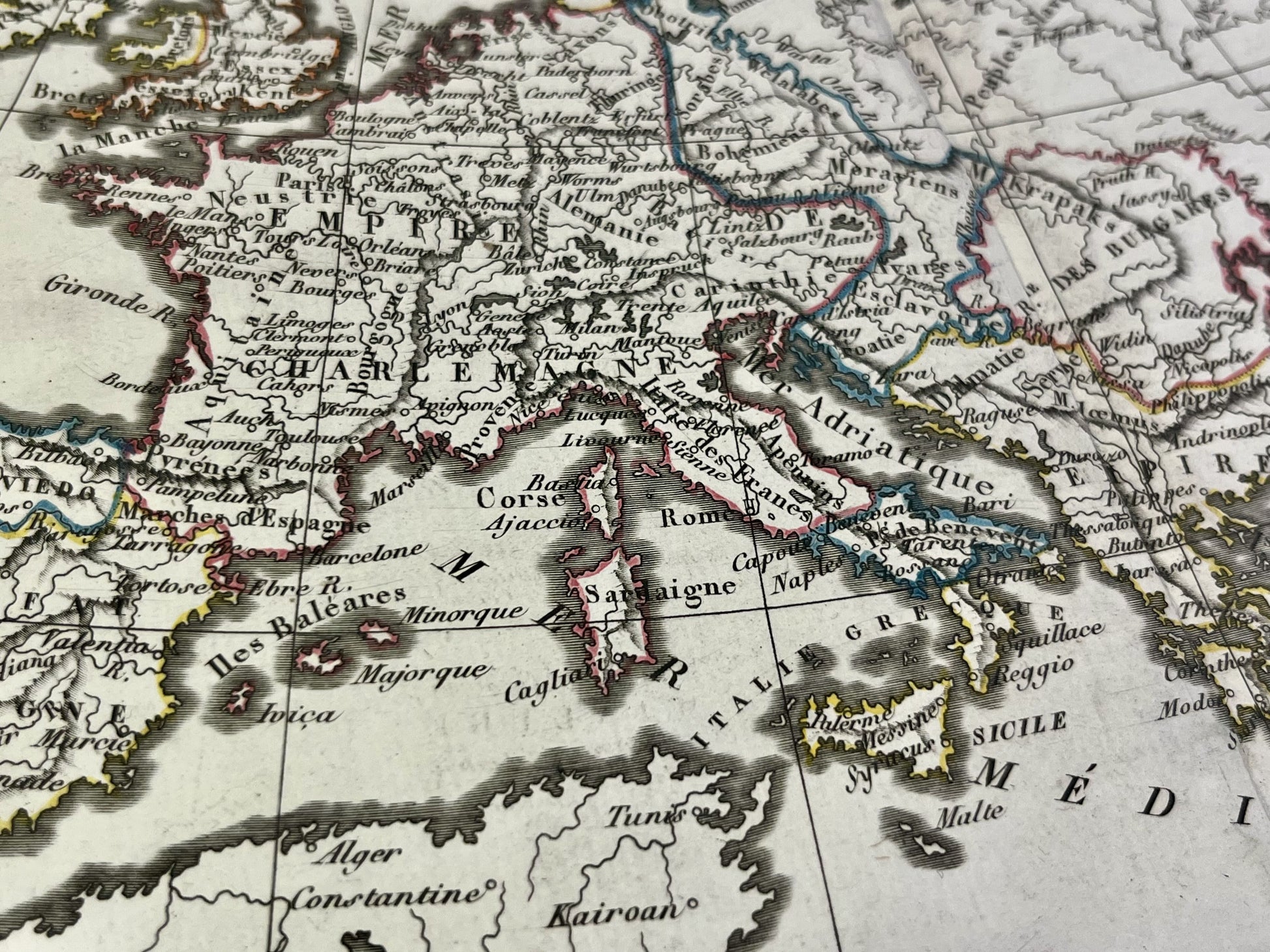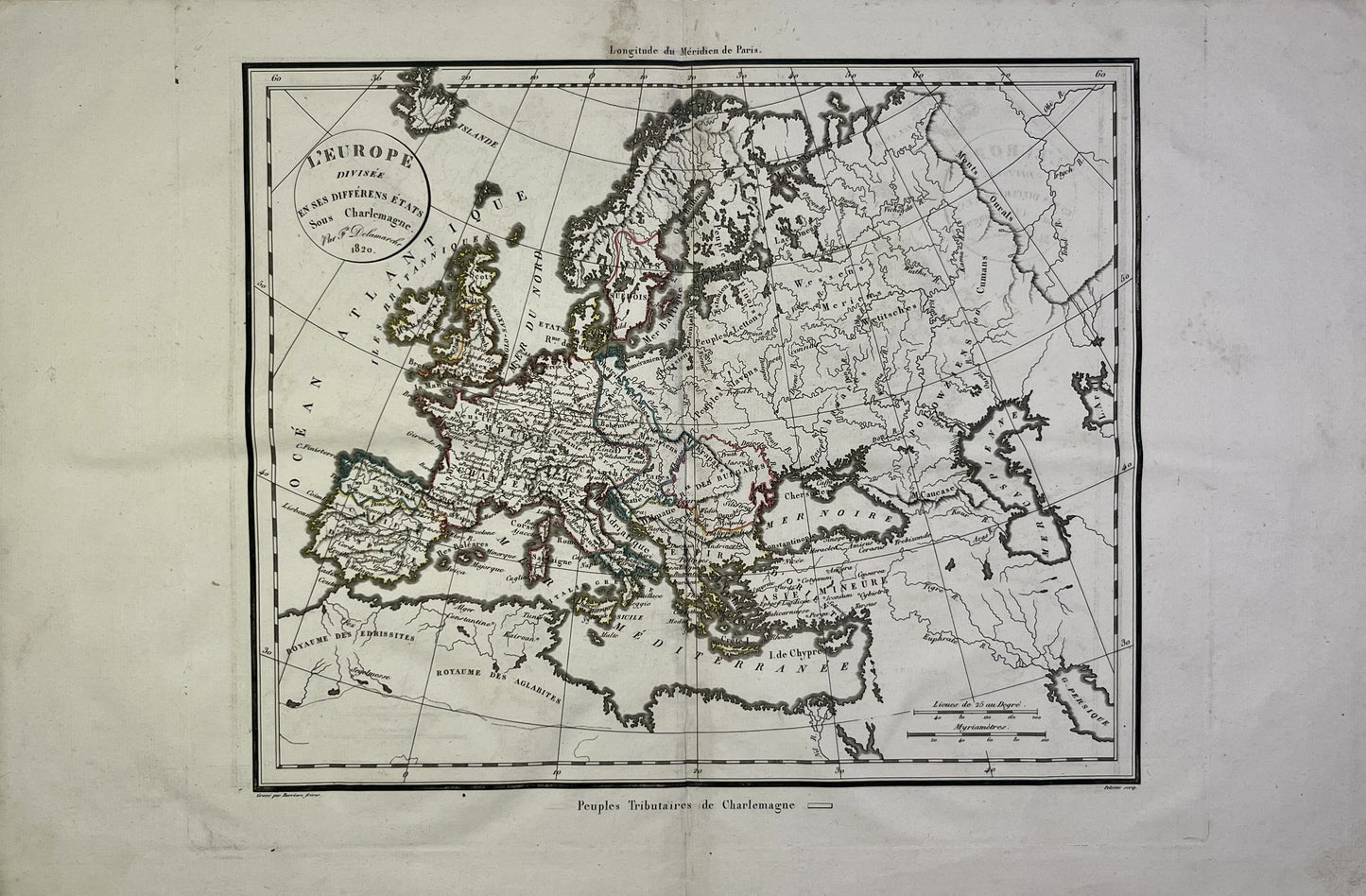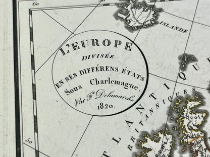 This antique map representing Europe under Charlemagne was produced by Félix Delamarche, successor to Robert de Vaugondy, Geographer to the King. It dates from 1820 and its dimensions are 47x32cm.