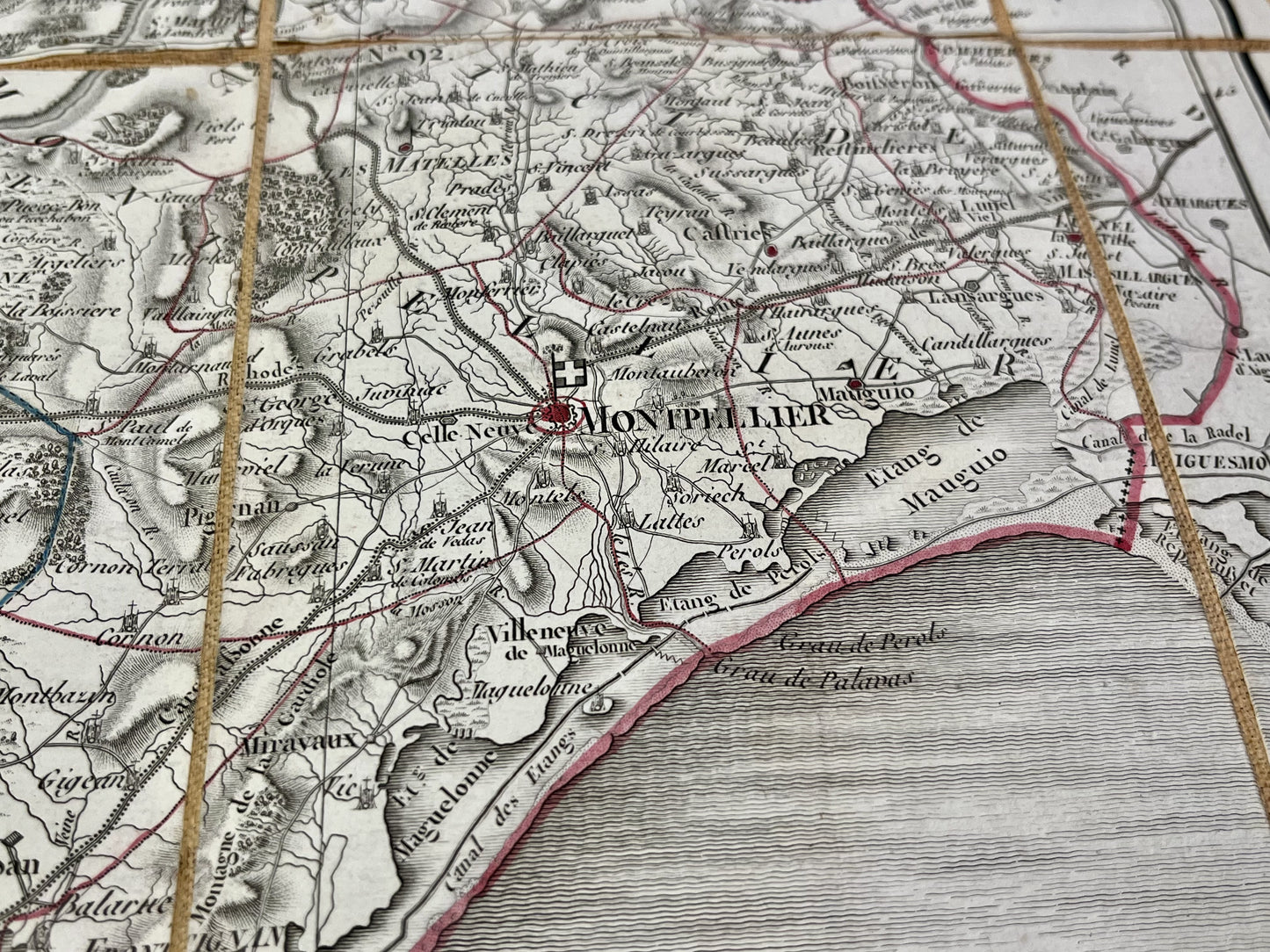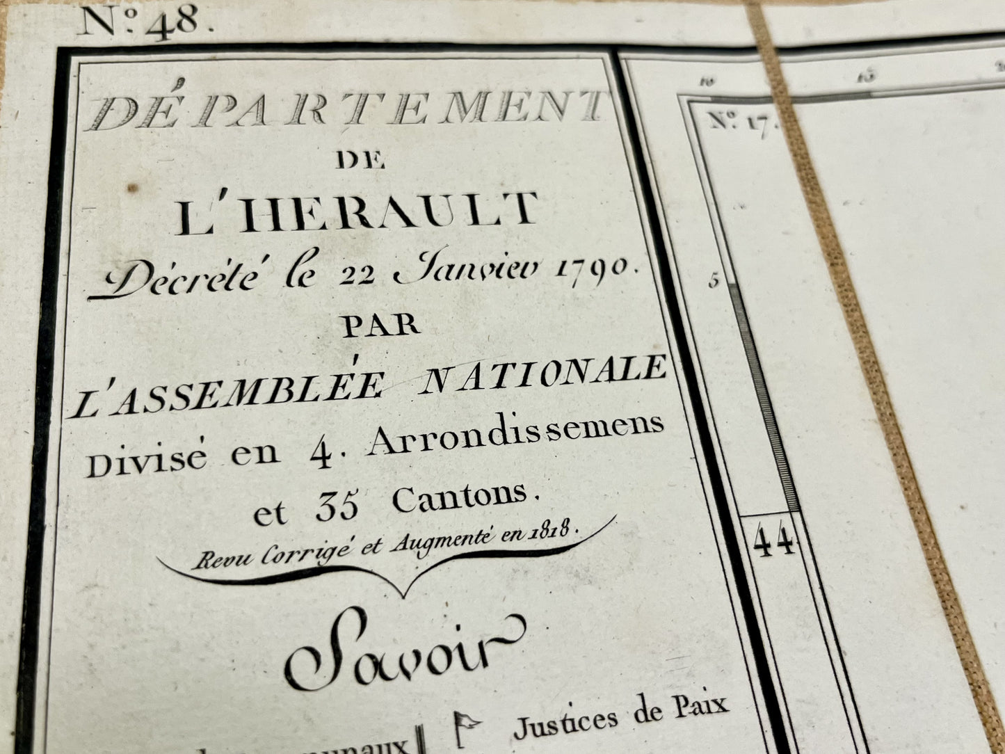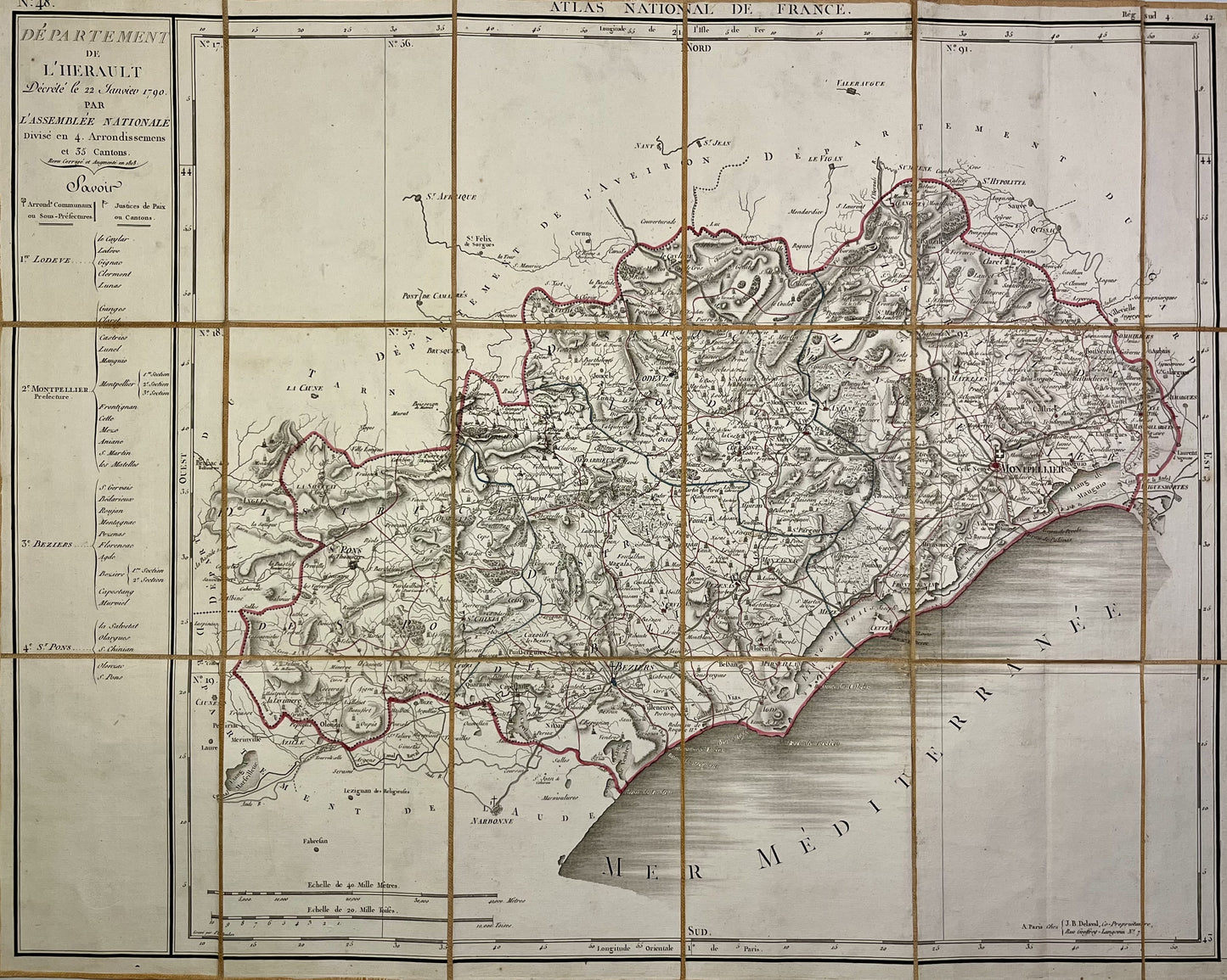 This antique map of the Hérault department is canvas-backed and was created by the French geographer Pierre-Gilles Chanlaire in the early 19th century. It is from the Atlas National de France and measures 67.5x53.5cm.