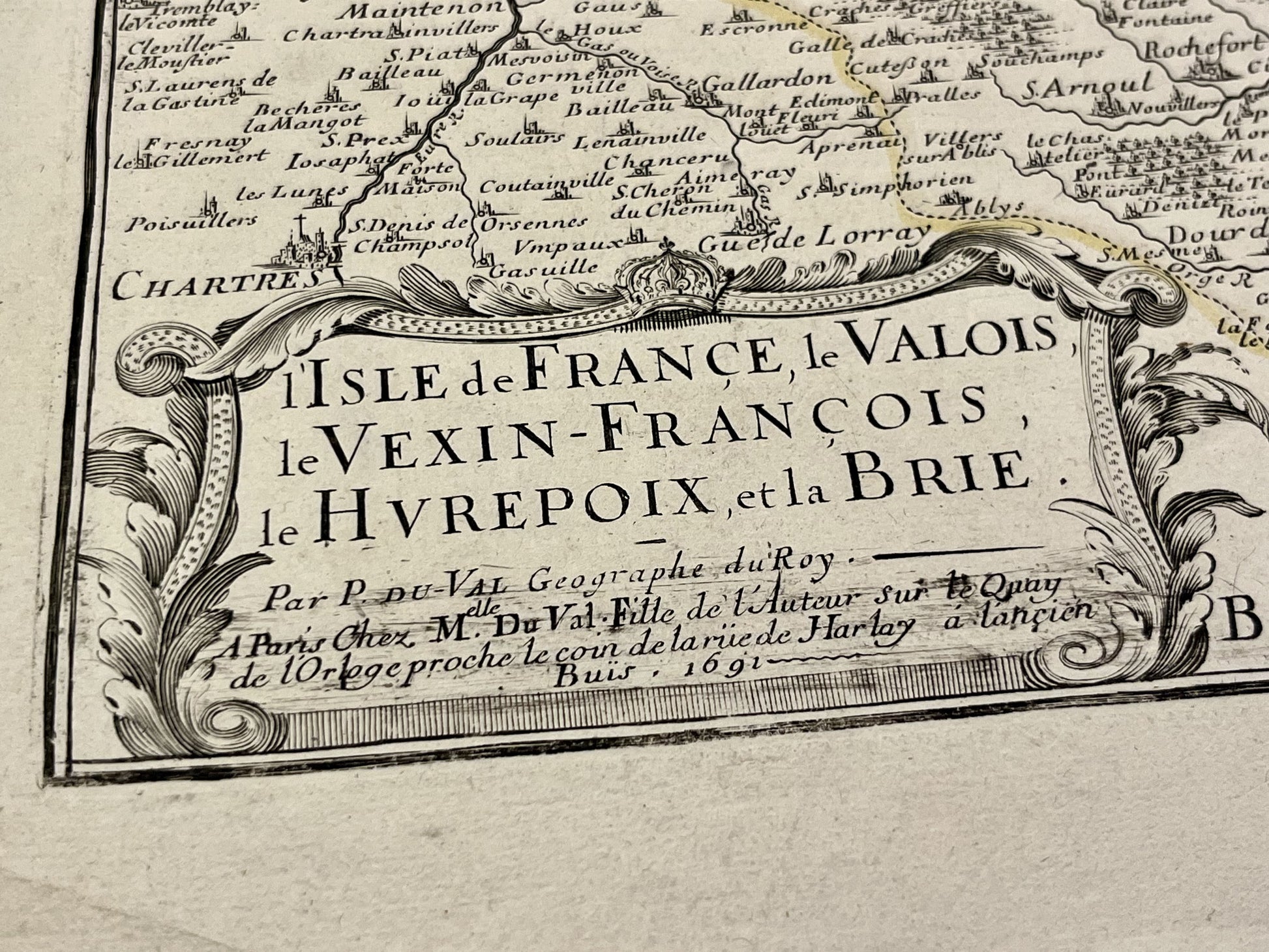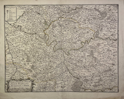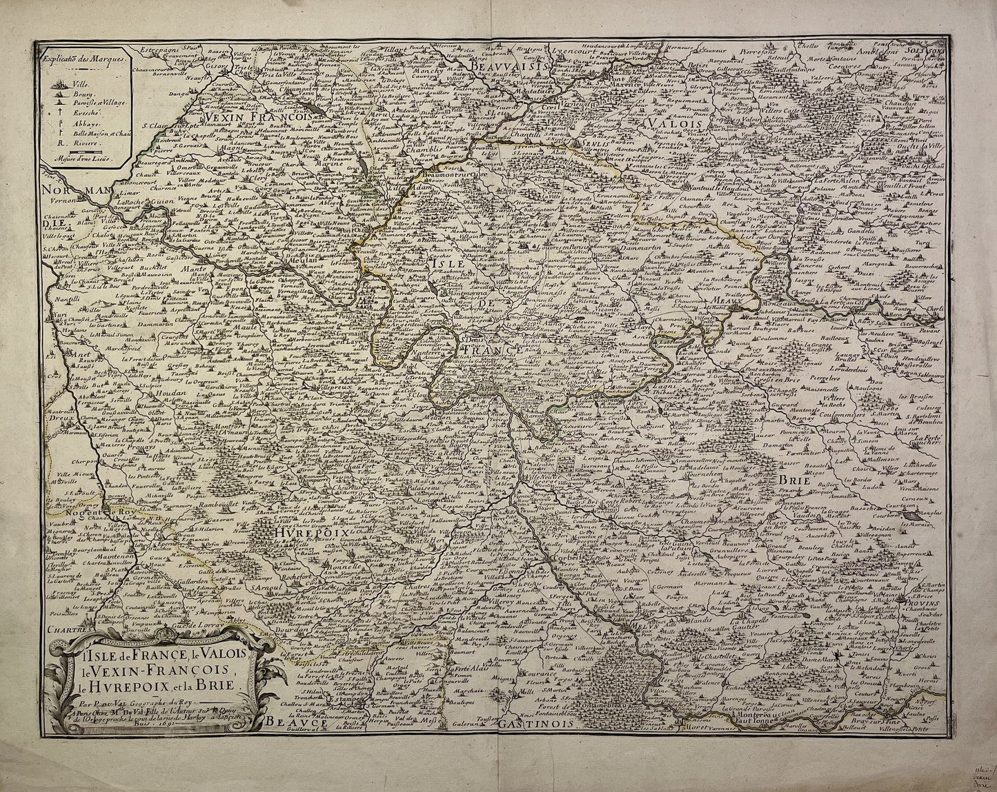 This antique map of Île-de-France, Valois, Vexin, Hurepoix and Brie was produced by the geographer Pierre Duval and published by his daughter in 1691. Its dimensions are 57.5x46cm.