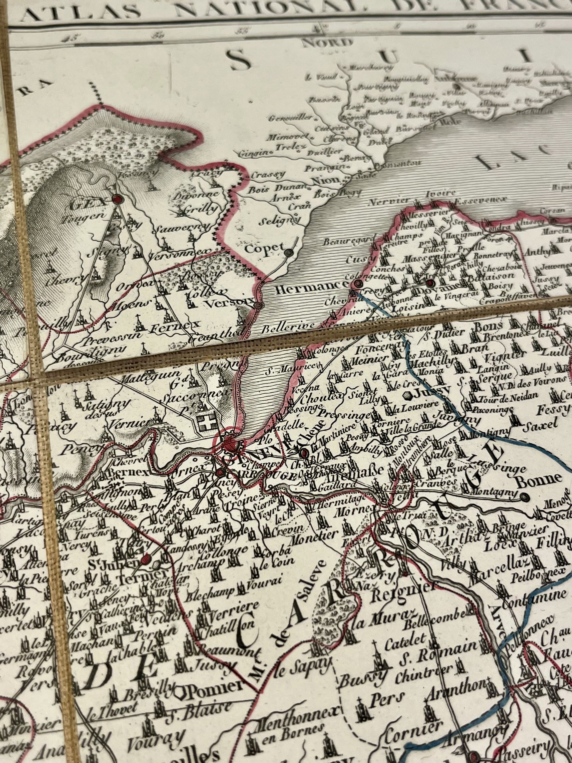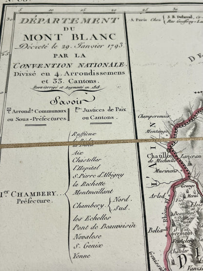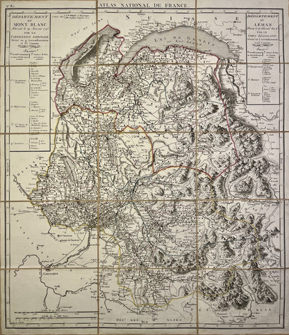 This antique map of Haute-Savoie and part of Savoy, representing the departments of Leman and Mont-Blanc during the First Empire, is canvas-backed and was created by the French geographer Pierre-Gilles Chanlaire in the early 19th century. It comes from the Atlas National de France and measures 61.5x53.5cm.