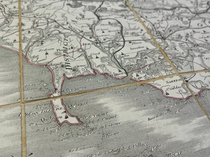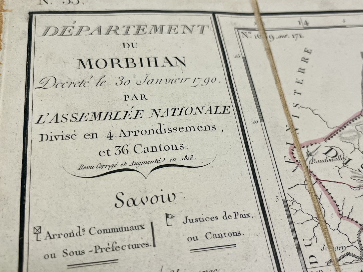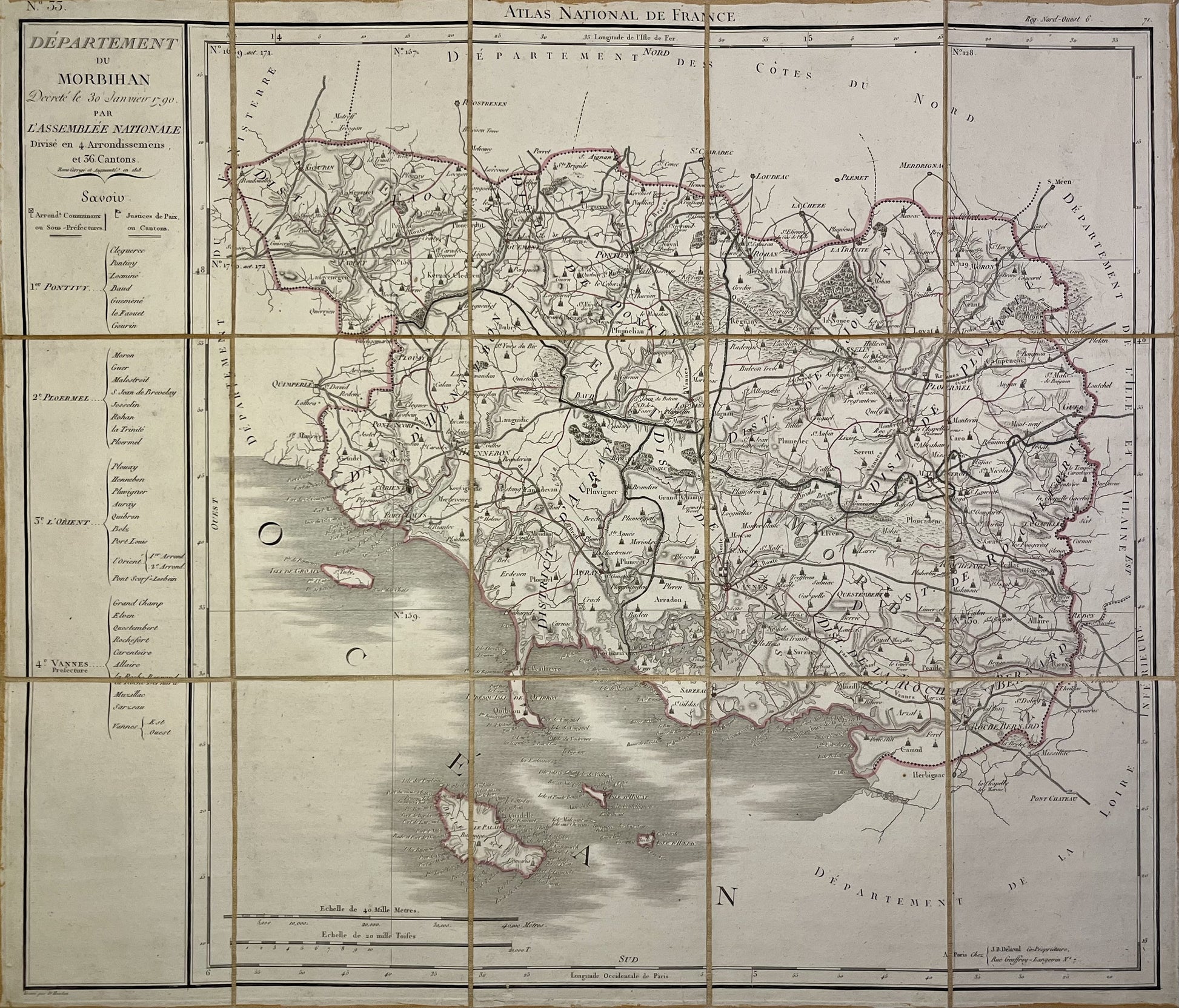 This antique map of the Morbihan department is canvas-backed and was created by the French geographer Pierre-Gilles Chanlaire in the early 19th century. It is from the Atlas National de France and measures 63x54cm.