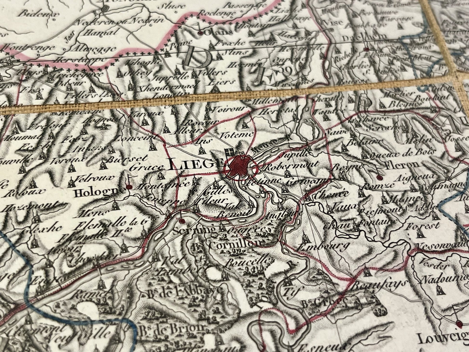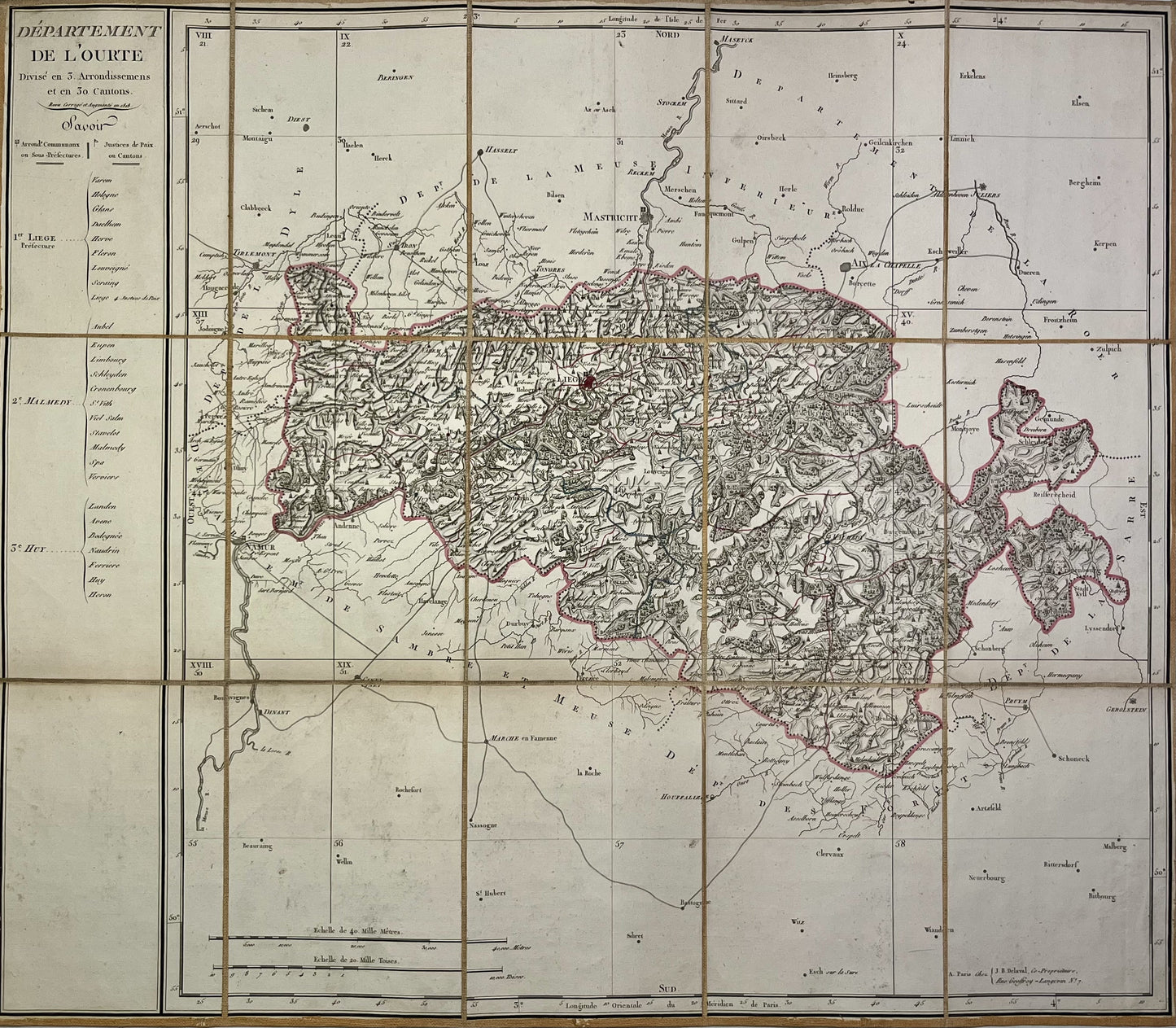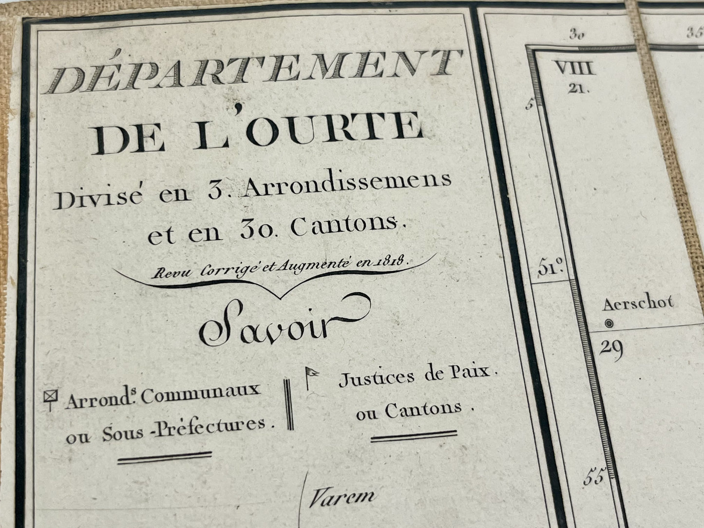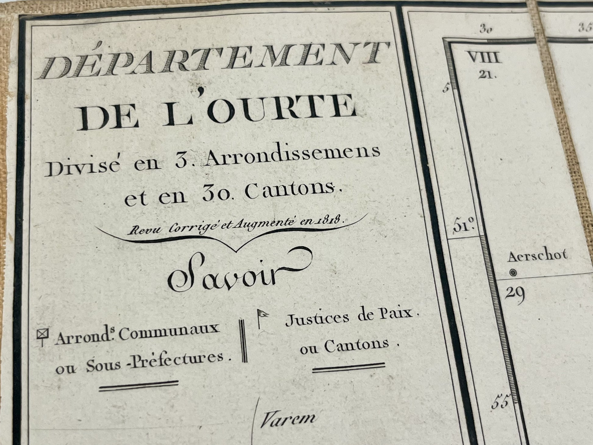 This antique map of Belgium, depicting the First Empire department of Ourte, is canvas-backed and was created by French geographer Pierre-Gilles Chanlaire in the early 19th century. It is from the Atlas National de France and measures 63x52cm.