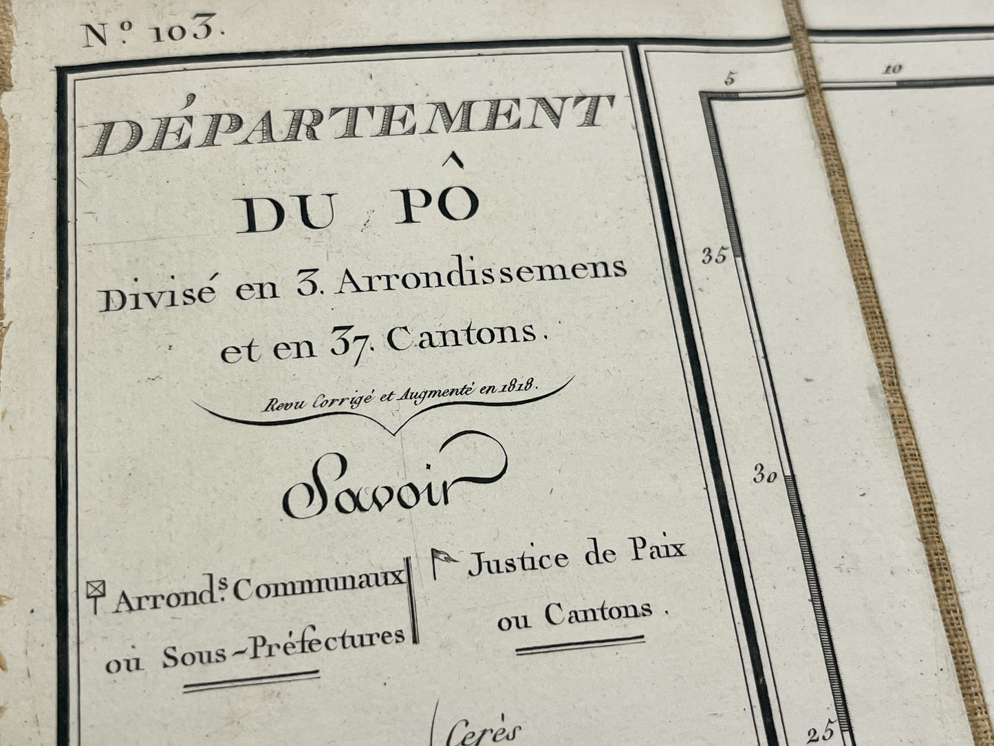 This antique map of Italy, depicting the department of the First Empire named Po, is canvas-backed and was created by the French geographer Pierre-Gilles Chanlaire in the early 19th century. It is from the Atlas National de France and measures 62.5x51.5cm.