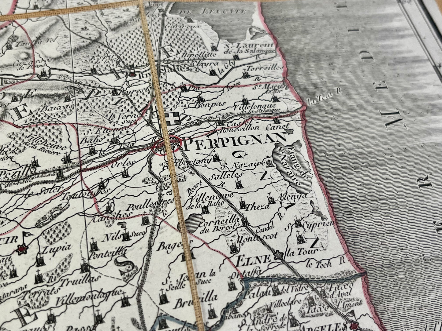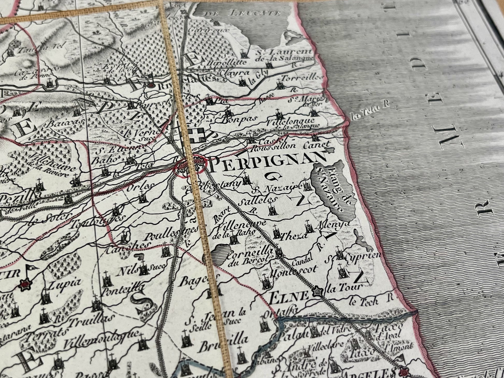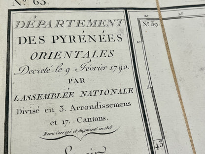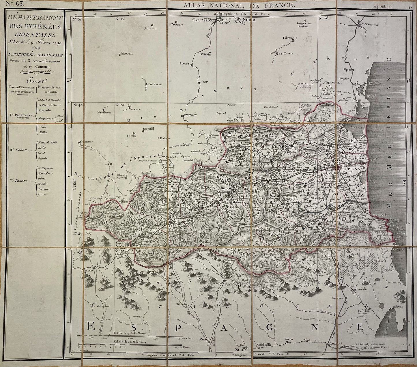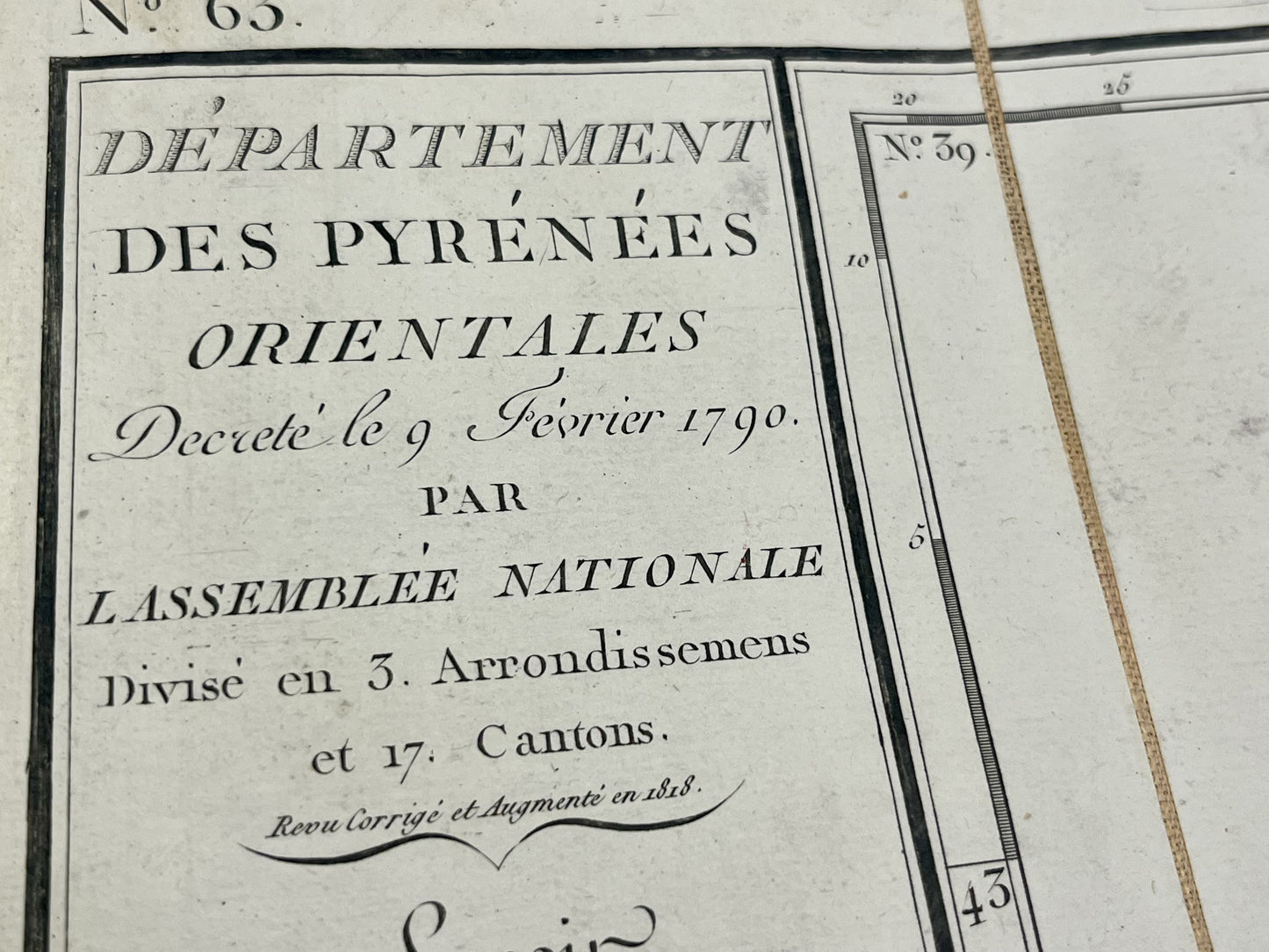 This antique map of the Pyrénées-Orientales department is canvas-backed and was created by the French geographer Pierre-Gilles Chanlaire in the early 19th century. It is from the Atlas National de France and measures 61.5x54cm.