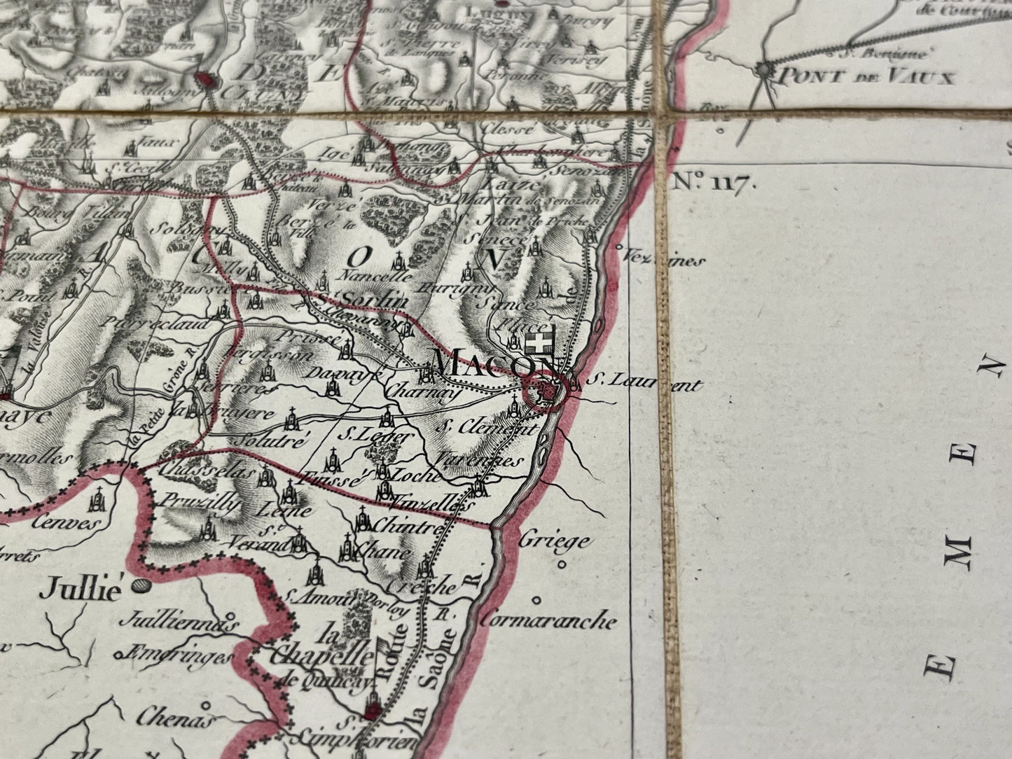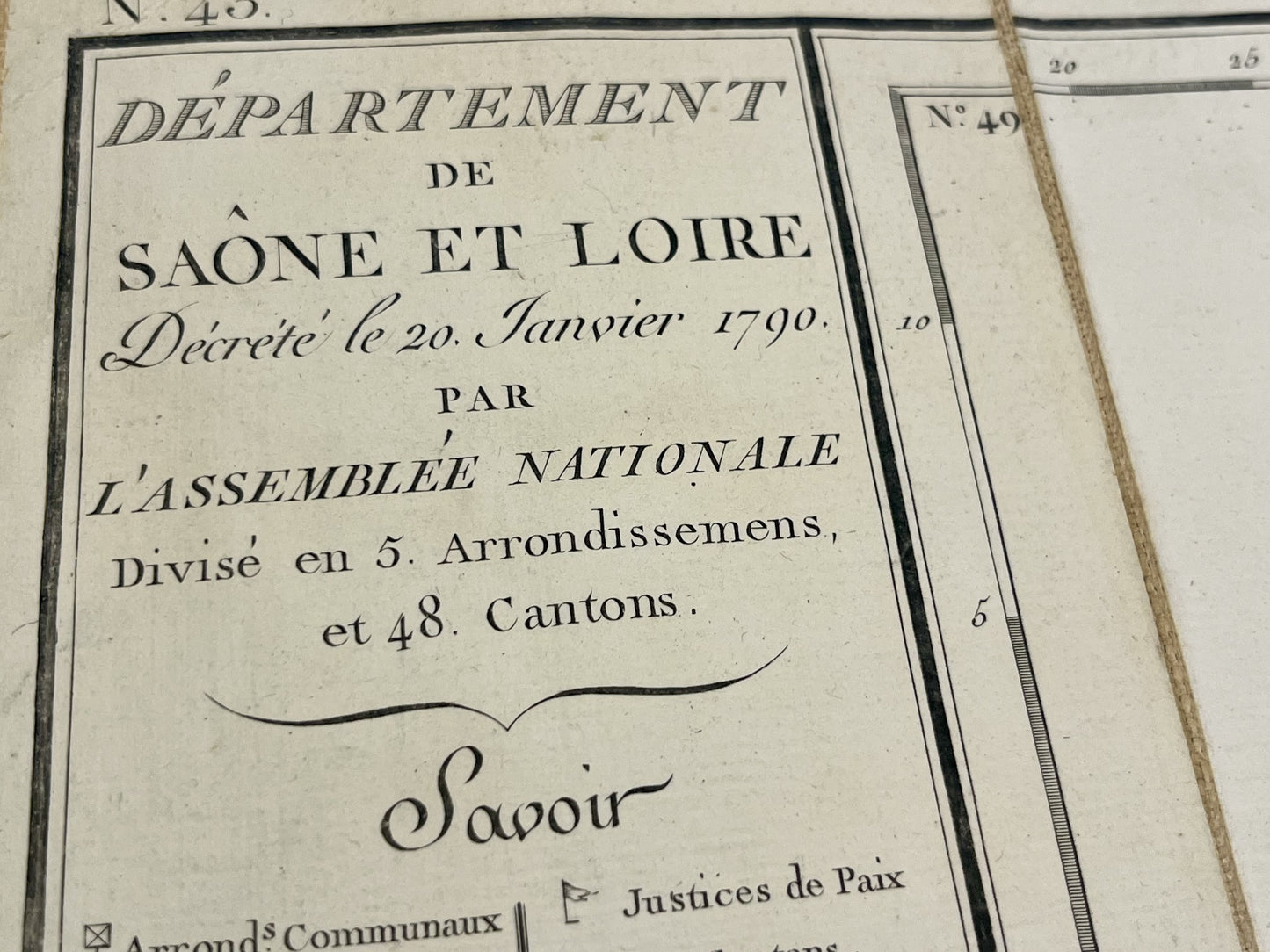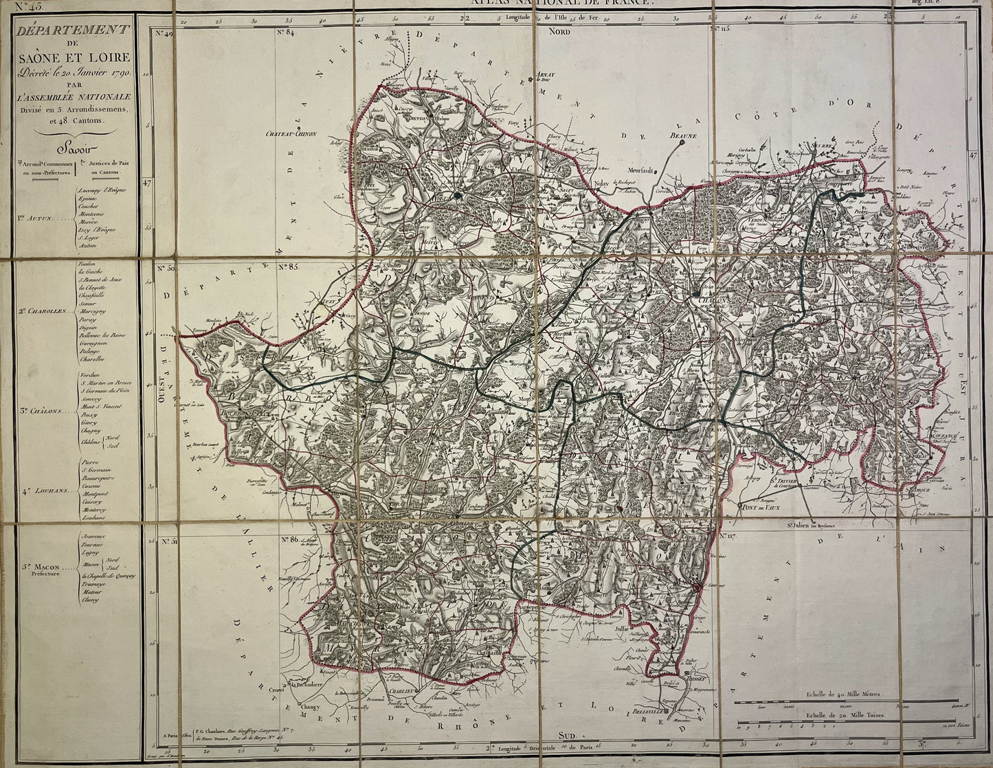 This antique map of the Saône-et-Loire department is canvas-backed and was created by the French geographer Pierre-Gilles Chanlaire in the early 19th century. It is from the Atlas National de France and measures 68x53cm.