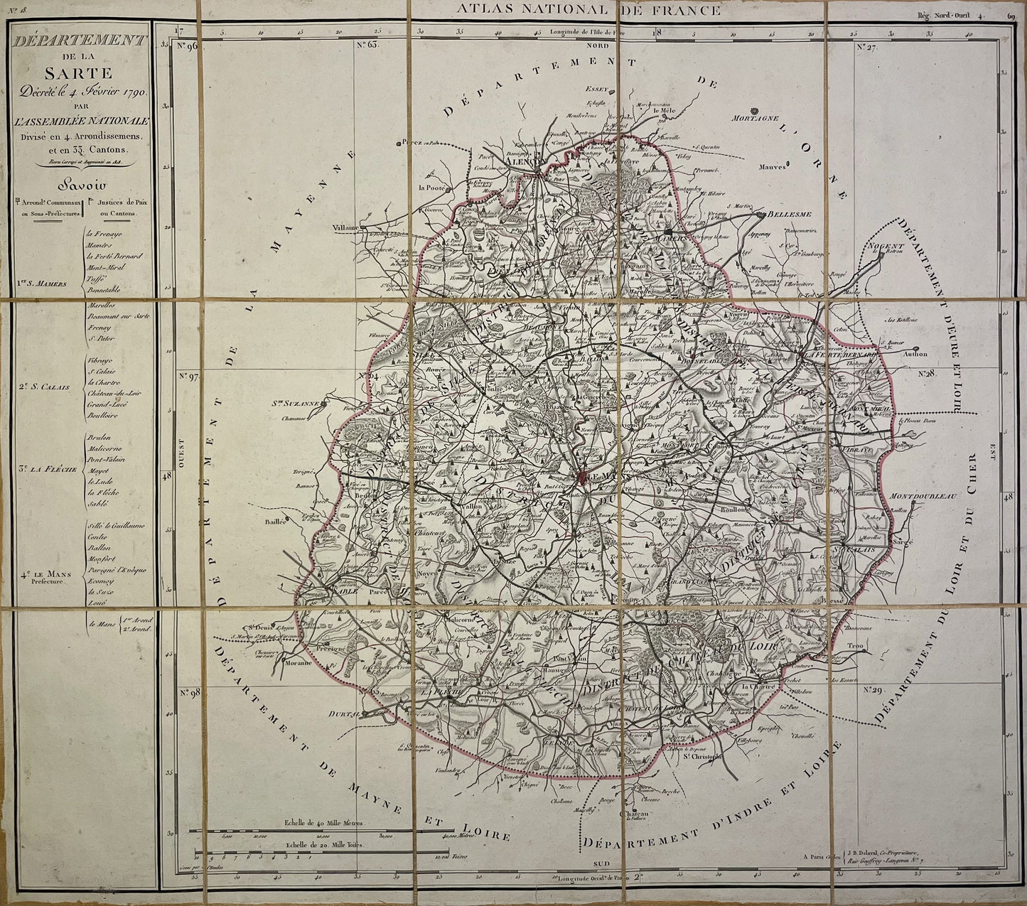 This antique map of the Sarthe department is canvas-backed and was created by the French geographer Pierre-Gilles Chanlaire in the early 19th century. It is from the Atlas National de France and measures 61.5x54cm.