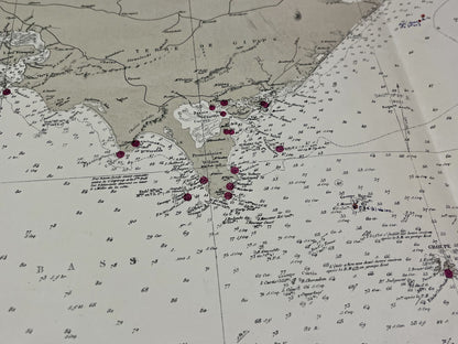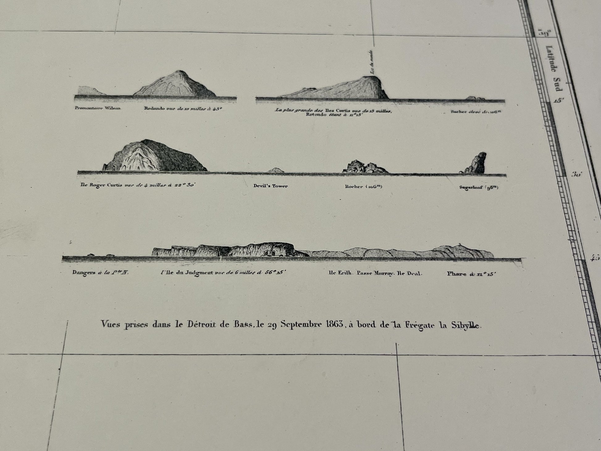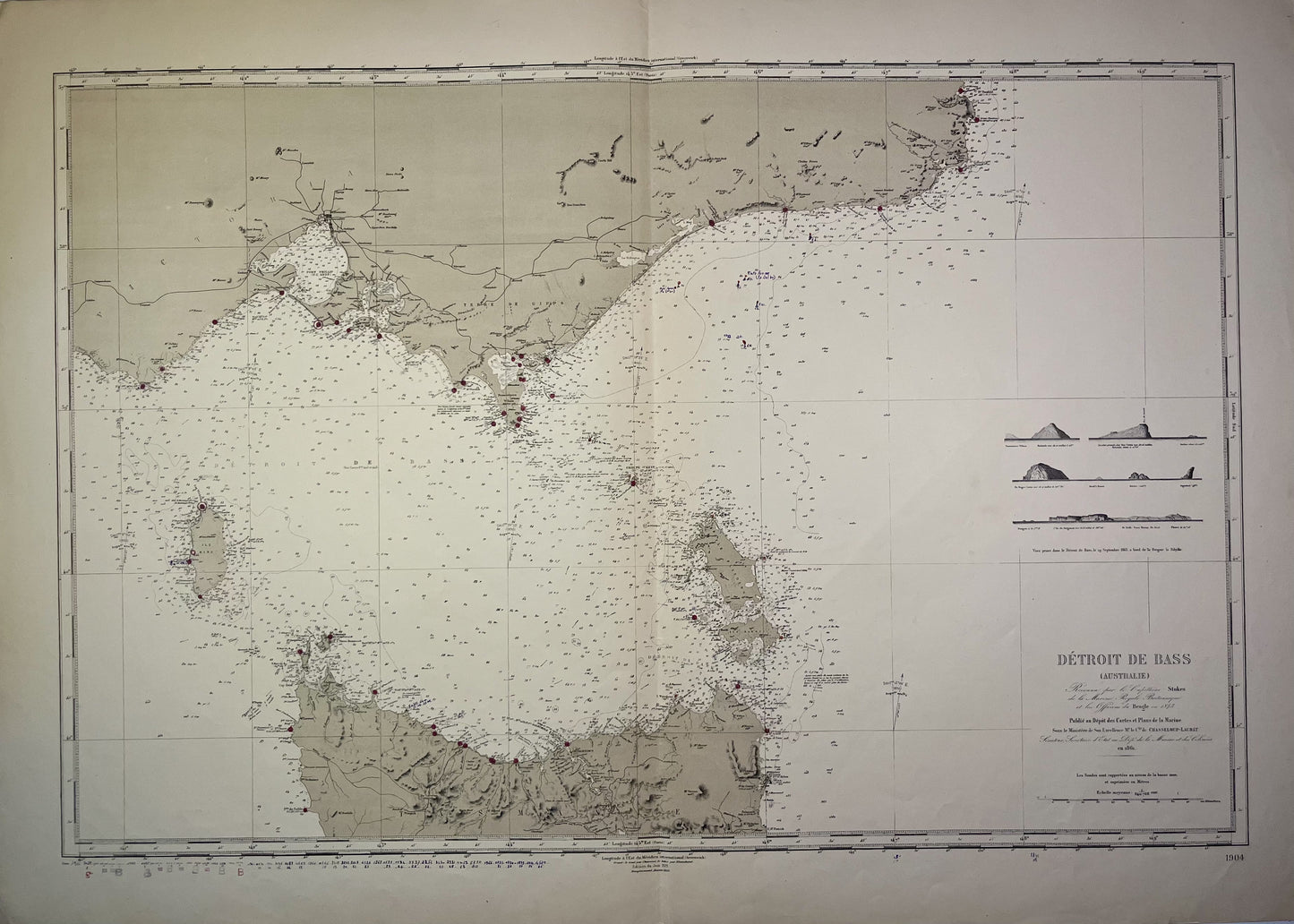 This antique nautical chart of Bass Strait, located between Tasmania and Australia, was published in the Dépôt des Cartes et Plans de la Marine. It dates from the middle of the 20th century and its dimensions are 106x75cm.