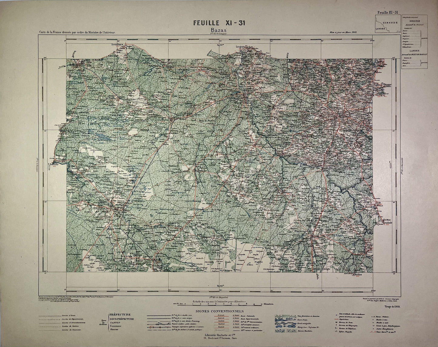 This old map of Gironde entitled "Bazas" (XI-31), was produced by the Ministry of the Interior from the end of the 19th to the beginning of the 20th century. Its dimensions are 57x45cm. To learn more, discover my article on the Vicinal Service map .