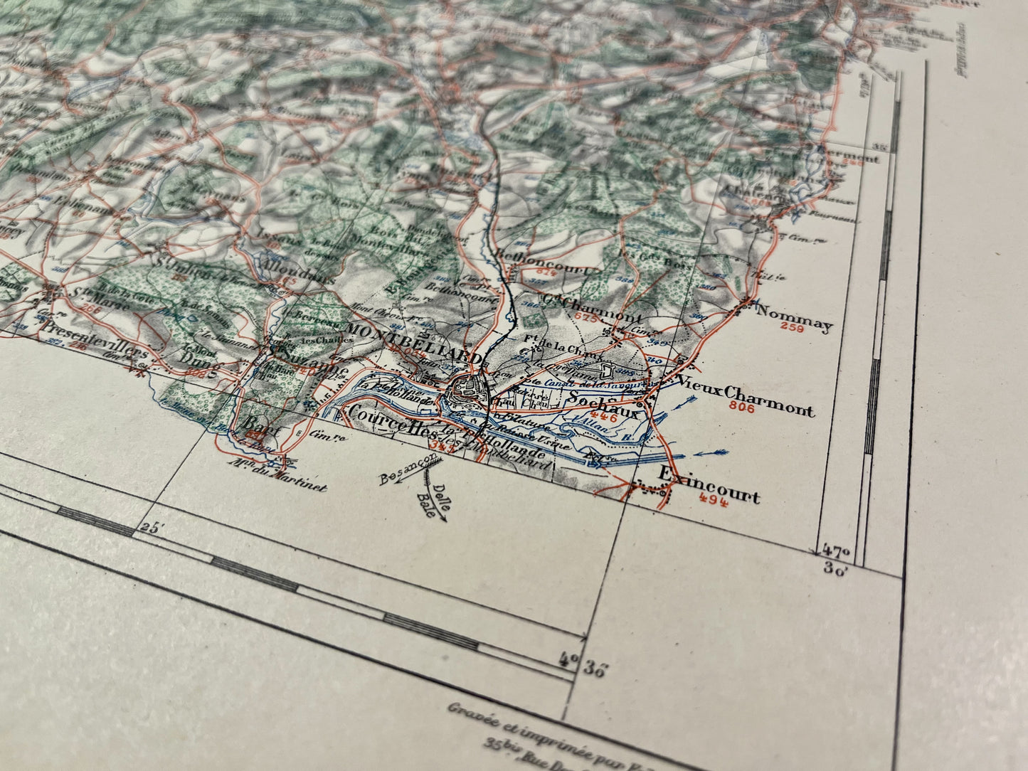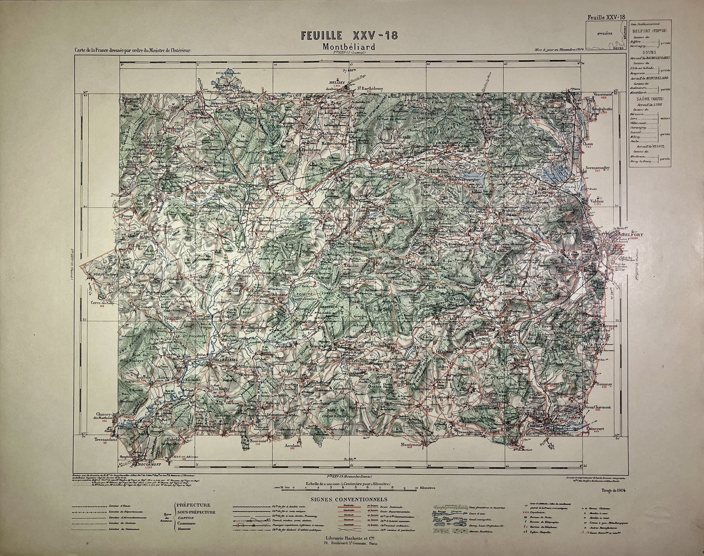 This old map of Haute-Saône entitled "Montbéliard" (XXV-18), was produced by the Ministry of the Interior from the end of the 19th to the beginning of the 20th century. Its dimensions are 57x45cm. To learn more, discover my article on the Vicinal Service map .