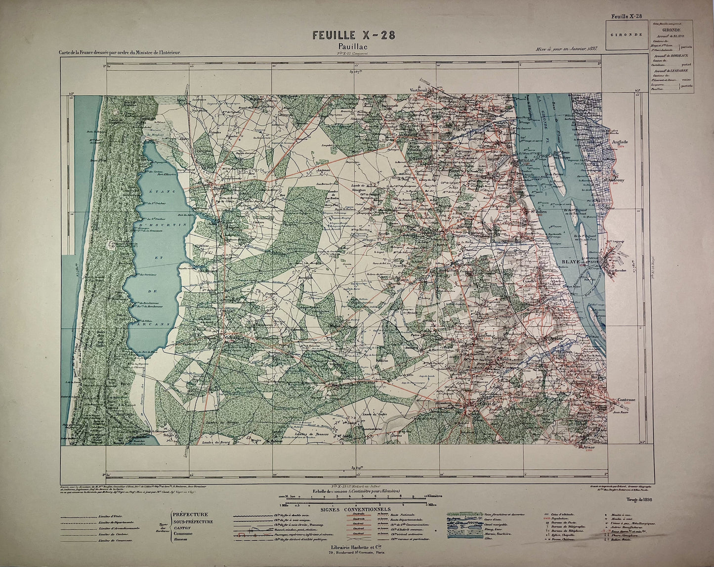 This old map of Gironde entitled "Pauillac" (X-28), was produced by the Ministry of the Interior from the end of the 19th to the beginning of the 20th century. Its dimensions are 57x45cm. To learn more, discover my article on the Vicinal Service map .