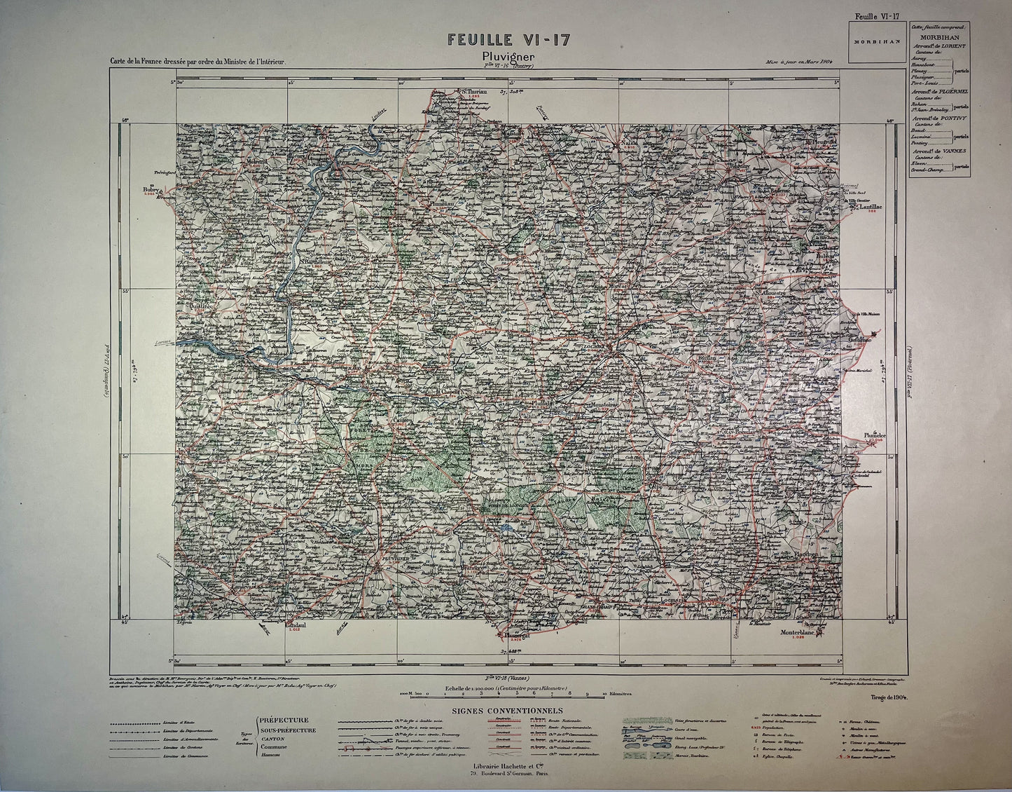 This old map of Morbihan entitled "Pluvigner" (VI-17), was produced by the Ministry of the Interior from the end of the 19th to the beginning of the 20th century. Its dimensions are 57x45cm. To find out more, read my article on the Vicinal Service map .