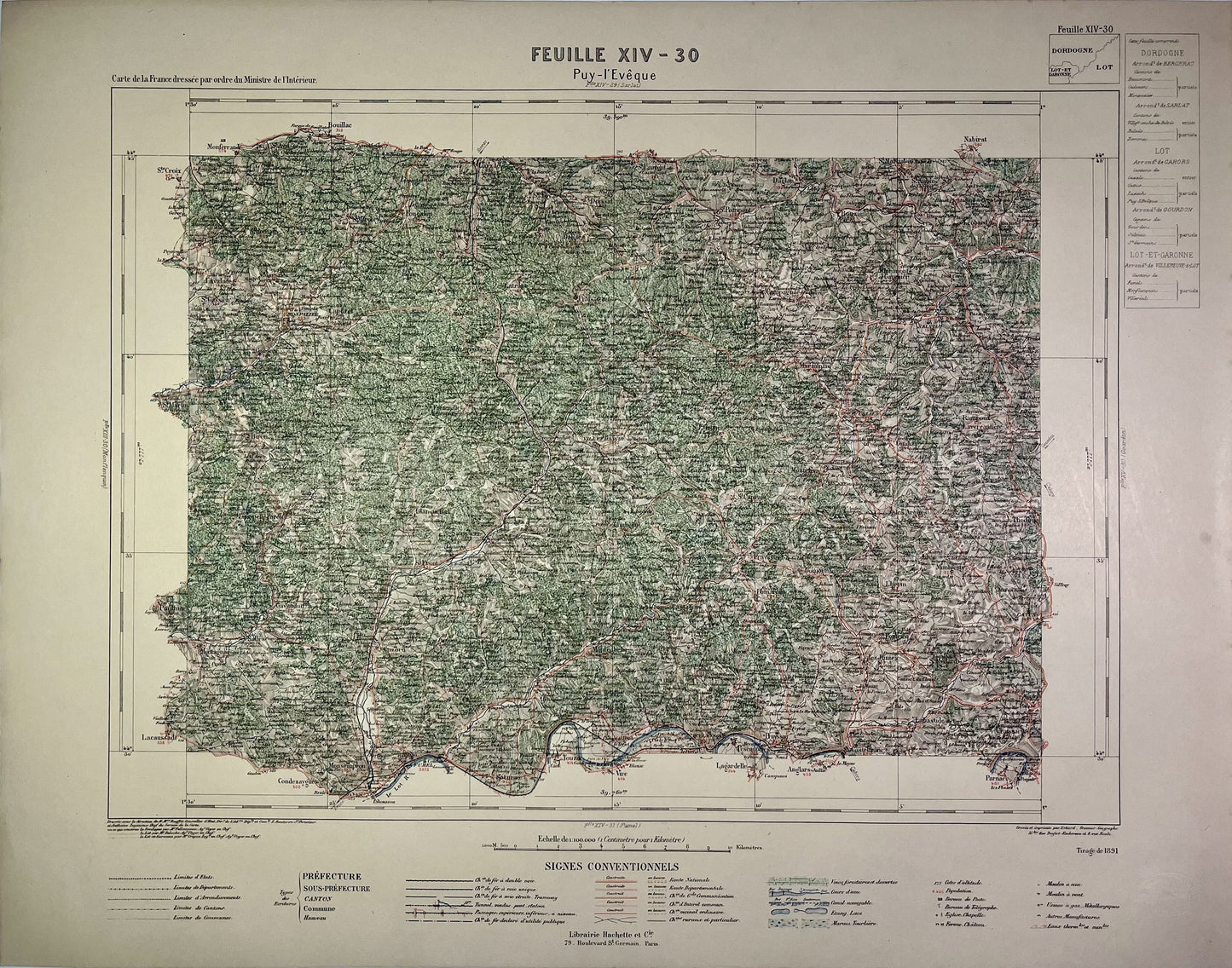 This old map spanning the Dordogne andLot rivers, entitled "Puy-l'Évêque" (XIV-30), was produced by the Ministry of the Interior from the end of the 19th to the beginning of the 20th century. Its dimensions are 57x45cm. To find out more, read my article on the Vicinal Service map .