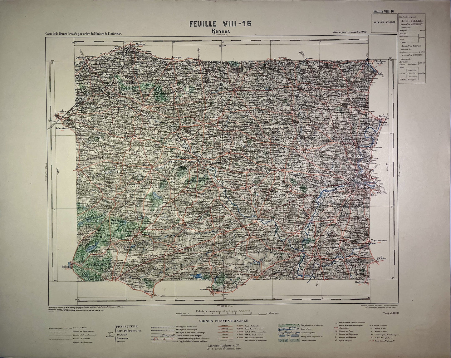 This old map of Ille-et-Vilaine entitled "Rennes" (VIII-16), was produced by the Ministry of the Interior from the end of the 19th to the beginning of the 20th century. Its dimensions are 57x45cm. To learn more, discover my article on the Vicinal Service map .