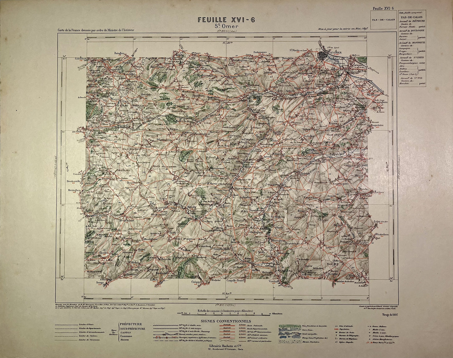 This old map of Pas-de-Calais entitled "Saint-Omer" (XVI-6), was produced by the Ministry of the Interior from the end of the 19th to the beginning of the 20th century. Its dimensions are 57x45cm. To find out more, read my article on the Vicinal Service map .