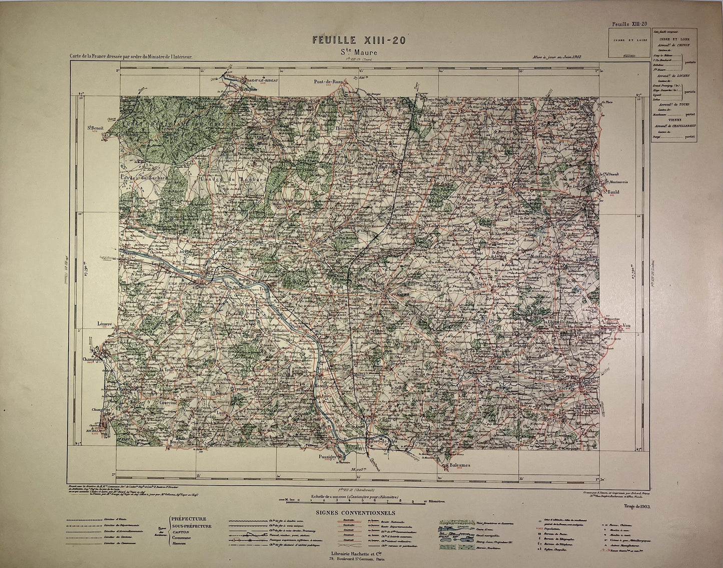 This old map of Indre -et-Loire entitled "Sainte-Maure" (XIII-20), was produced by the Ministry of the Interior from the end of the 19th to the beginning of the 20th century. Its dimensions are 57x45cm. To learn more, discover my article on the Vicinal Service map .