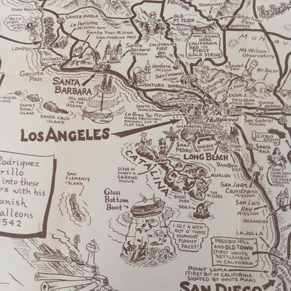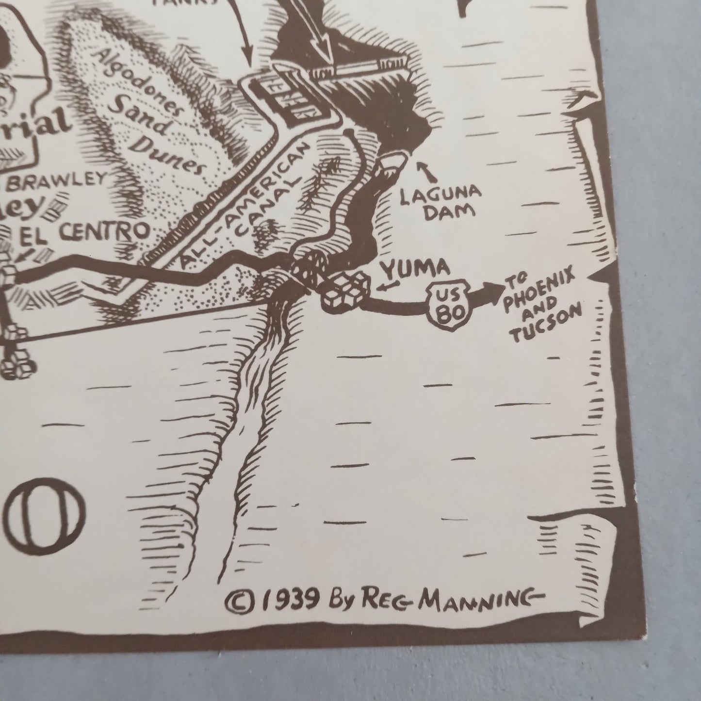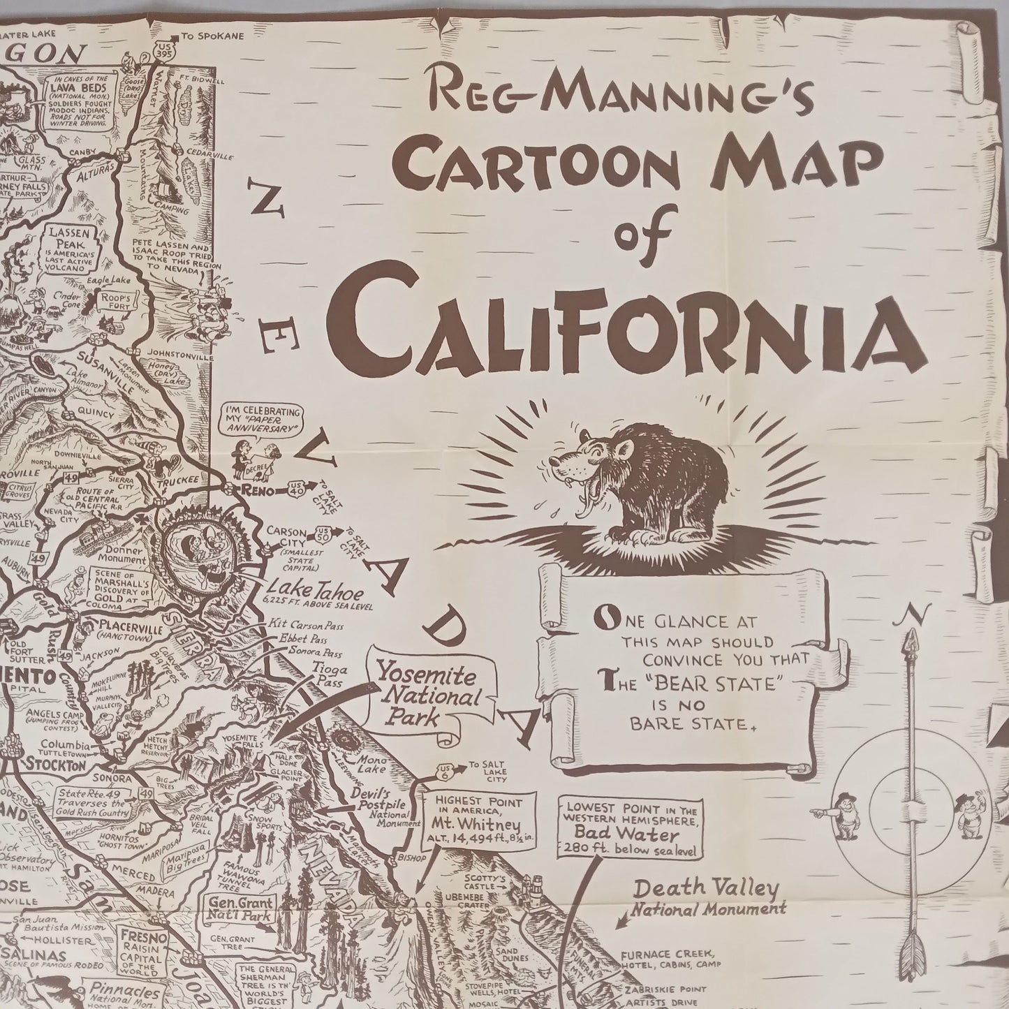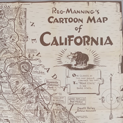 Immerse yourself in 1930s California with this magnificent illustrated humorous map by Reg Manning, the famous American cartoonist. Published in 1939, this 52 x 65 cm Cartoon Map of California offers a joyful and witty representation of the state, nicknamed here the "Bear State." Produced in a brown monochrome style typical of the era, the map is full of comic drawings, puns, and regional anecdotes. From San Diego to San Francisco, via Los Angeles, Death Valley, Yosemite, and even the Spanish missions, the entire Californian territory is revisited through the prism of graphic humor. Reg Manning brilliantly blends popular culture, geography, folklore, and history to deliver an offbeat but incredibly rich portrait of California on the eve of World War II. A true vintage collector's item, perfect for fans of old illustrated maps, retro American design, or Wild West wall decoration.