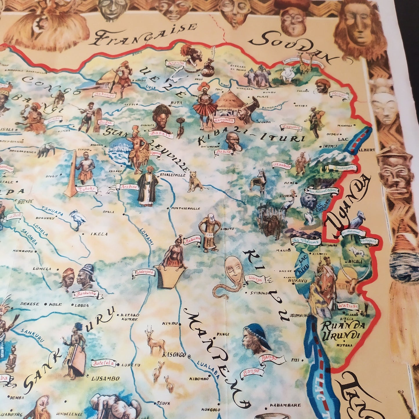 This map of the Belgian Congo, published in the 1950s, was produced with the permission of the Belgian Congo and Ruanda-Urundi Information and Tourism Office. It depicts the territory with numerous illustrations depicting fauna, flora, human activities, and local populations. Major cities such as Léopoldville, Élisabethville, Stanleyville, and Coquilhatville are indicated, as well as the main rivers and geographical areas. The border is decorated with traditional masks and figures, highlighting the colonial aesthetic of the time. Dimensions: 55 x 50 cm.