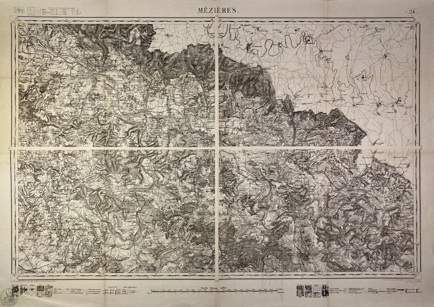 This General Staff map entitled "Mézières" (N°24) was printed by Lermercier et Cie at the end of the 19th century on fine paper measuring 89.5x63cm. It is indicated on the back that it belonged to the Captain-Commander of the Bourges Divisional Artillery Regiment.