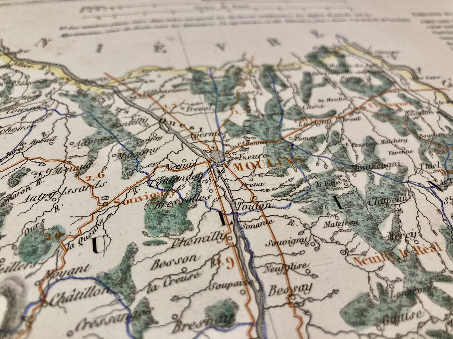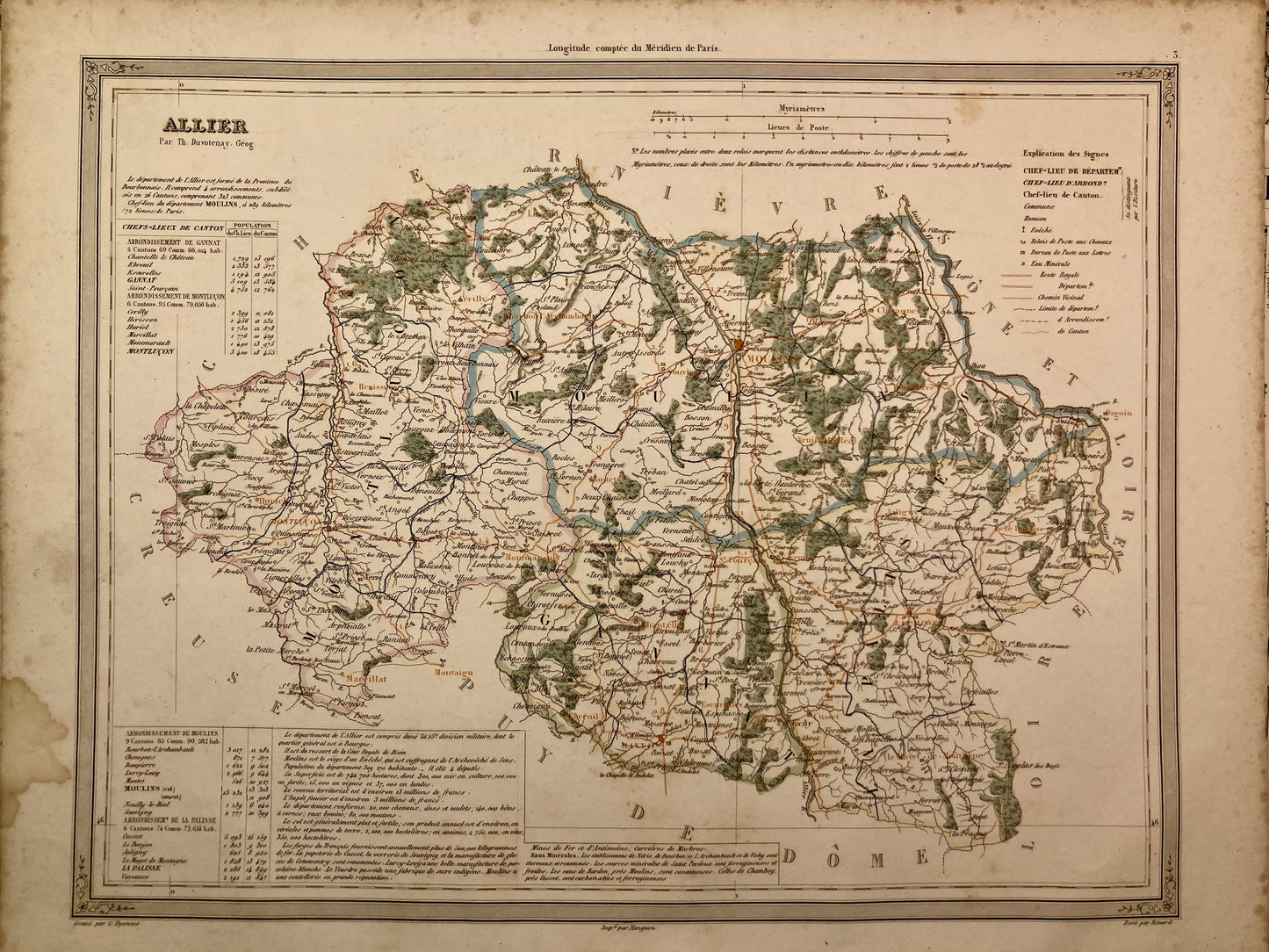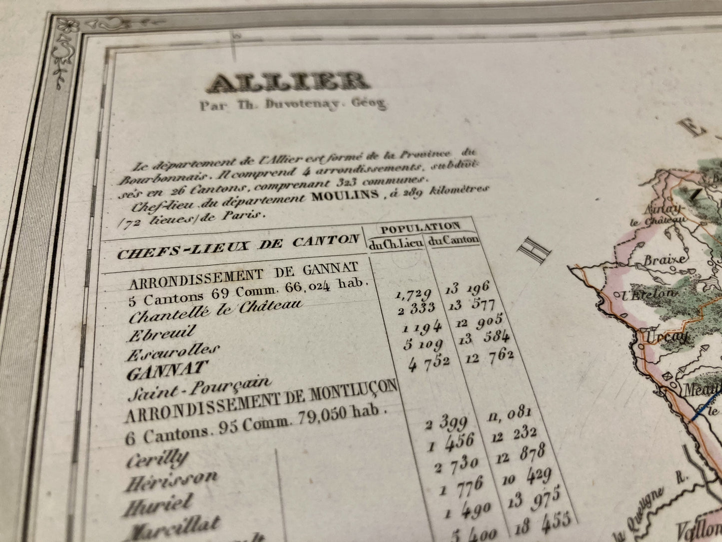This old map of Allier accompanied by some statistics comes from the Atlas of the 86 departments and the French Colonies. It was produced by the Geographer Auguste-Henri Dufour and printed during the 19th century. Its size is 41x32cm.