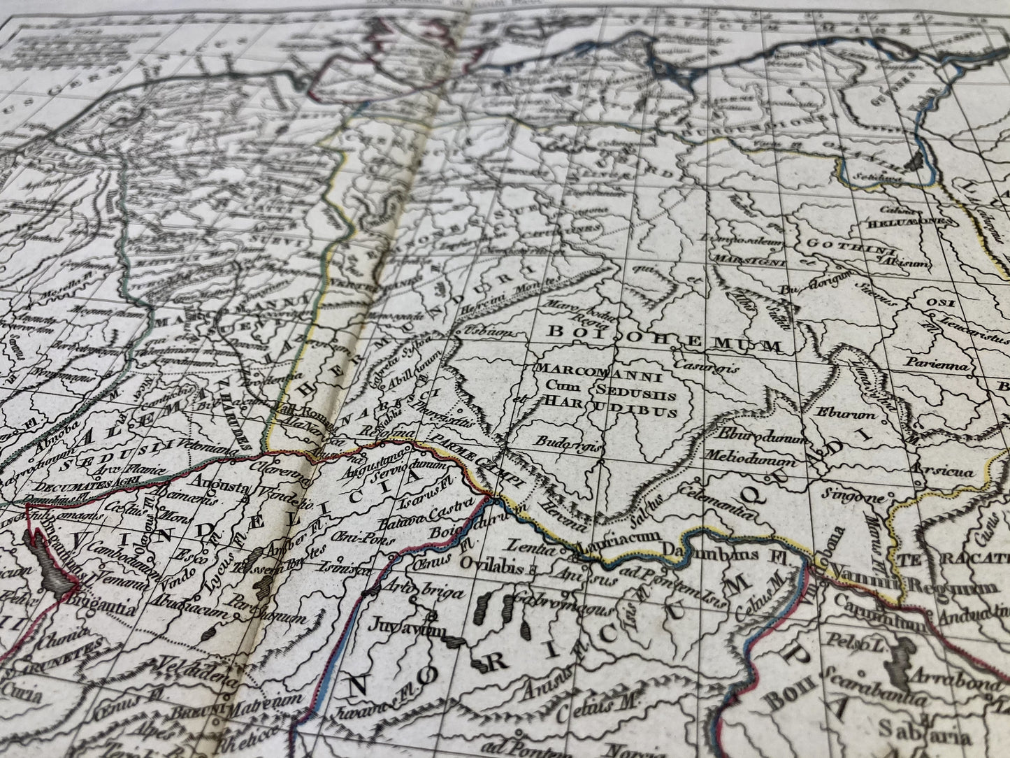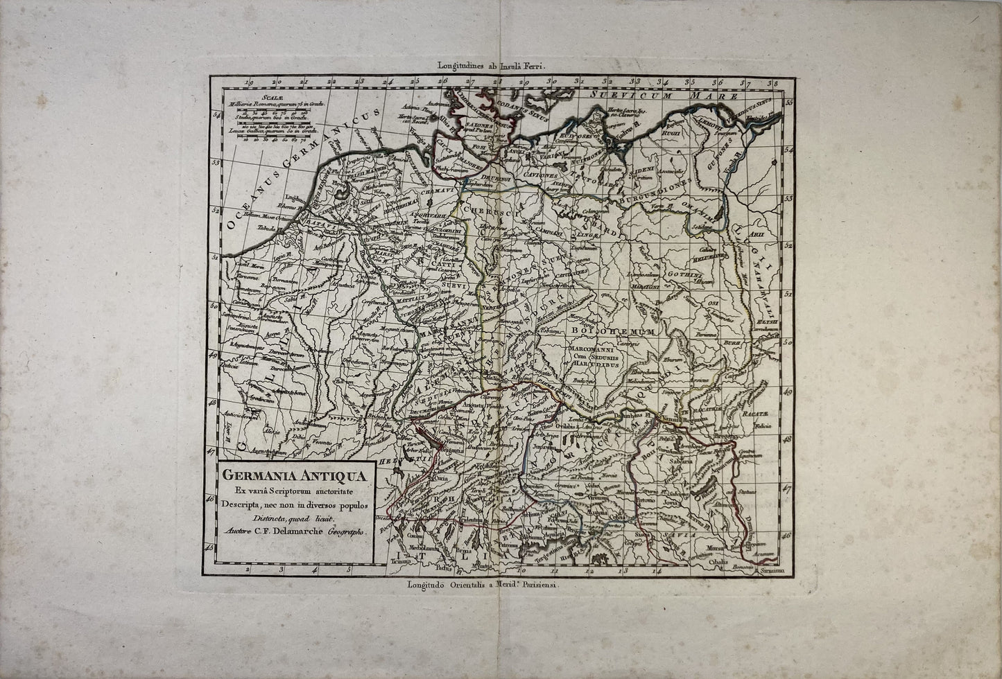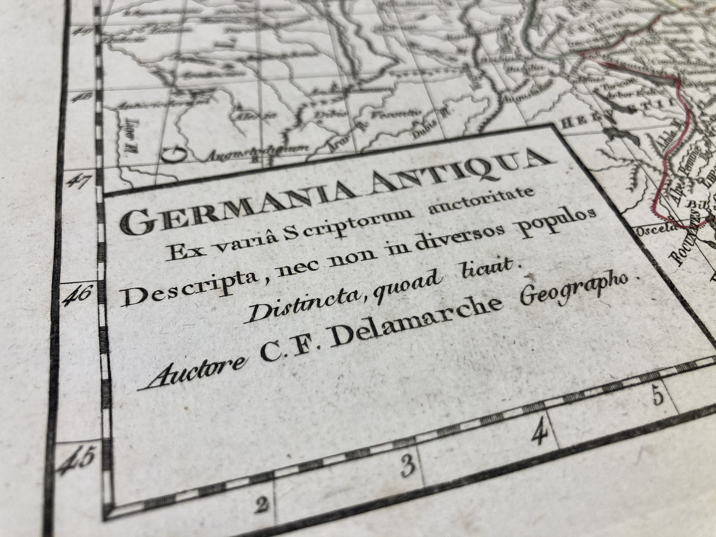 This antique map of ancient Germany was created by Félix Delamarche, successor to Robert de Vaugondy, Geographer of the King. It dates from the beginning of the 19th century and its size is 48x32cm.