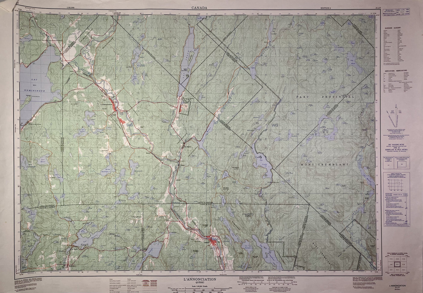 This old map of Canada represents the town of l'Annonciation and its surroundings, located in Quebec. It was published by the Department of Energy, Mines and Resources of Canada in 1977 and its dimension is 91.5x65cm.