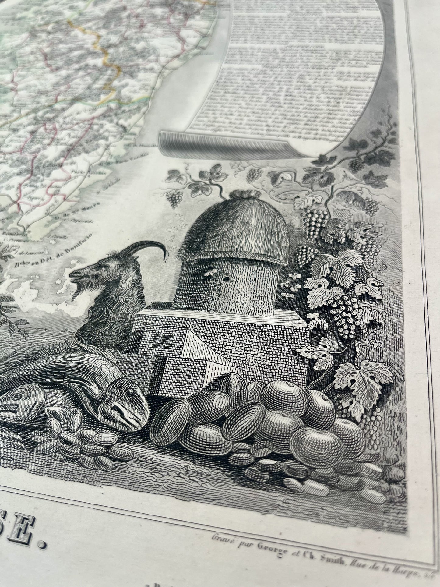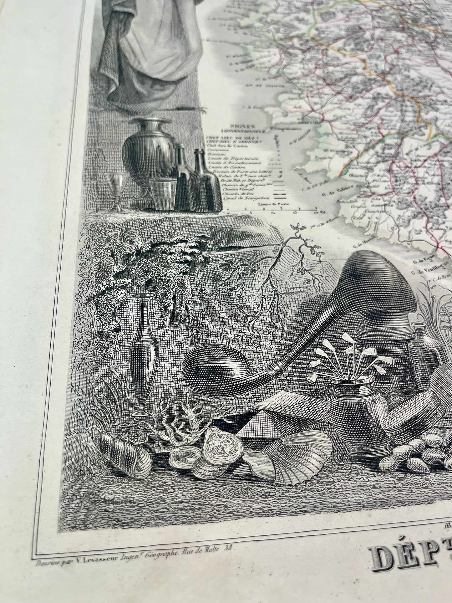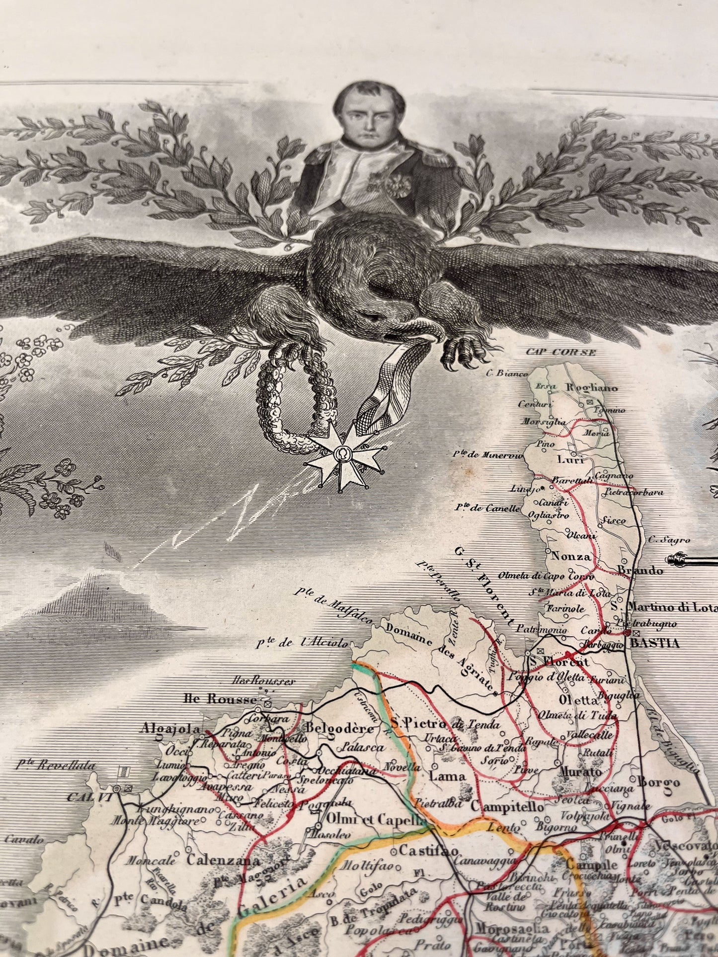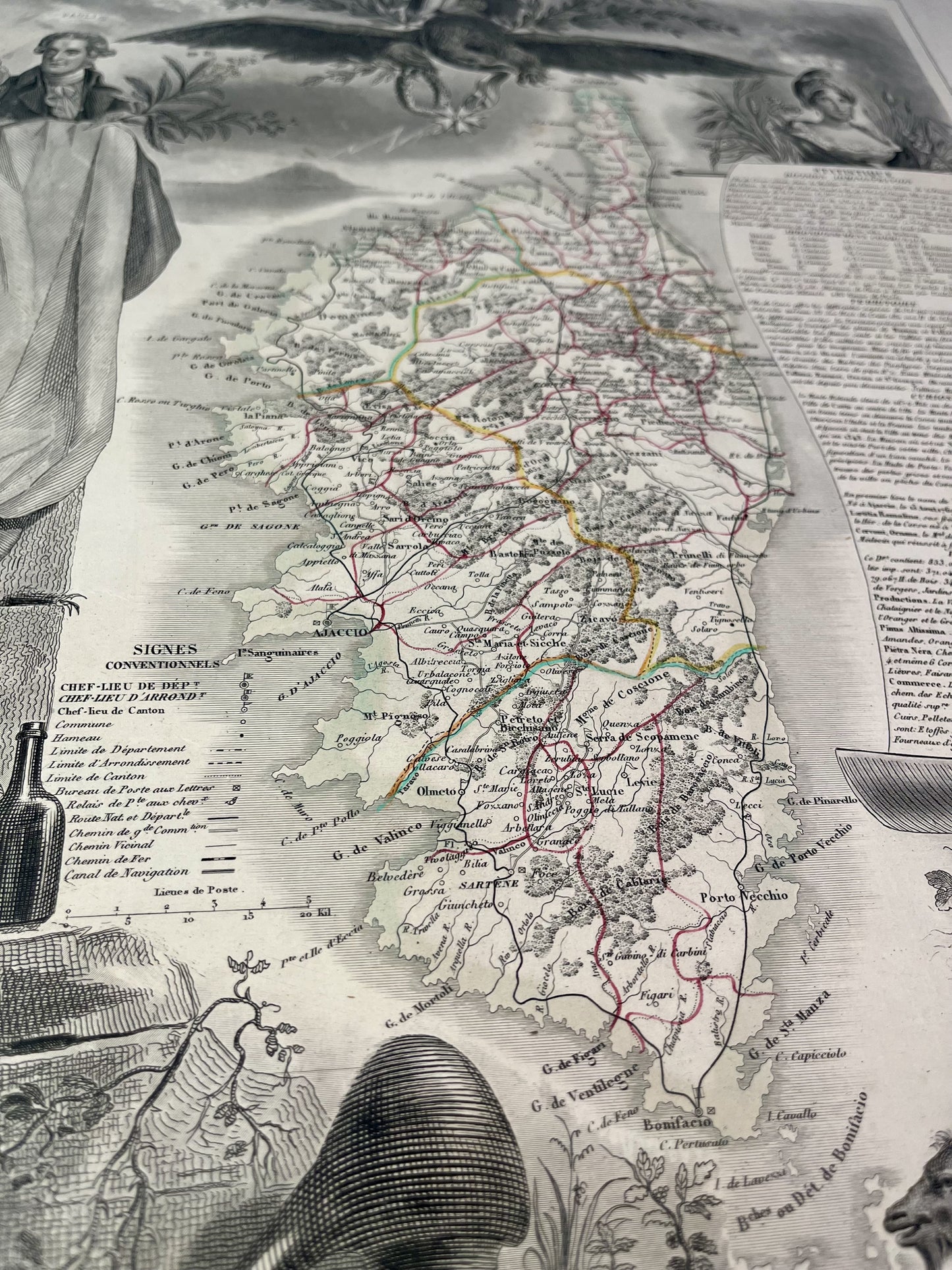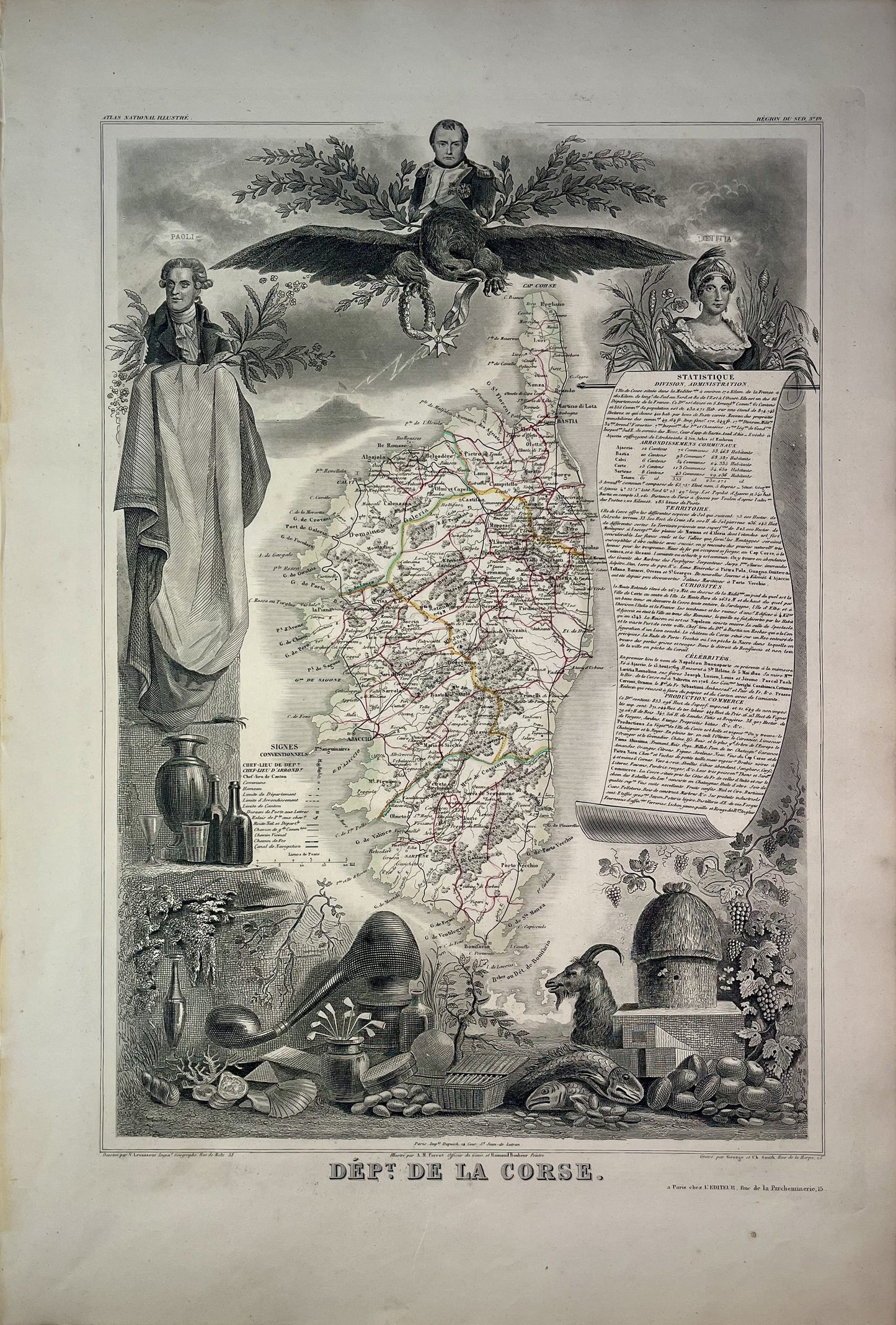 This antique map of Corsica is decorated with illustrations representing its specialties and some statistical, historical and economic information. It comes from the Illustrated National Atlas and was produced by the Geographer Victor Levasseur between 1842 and 1872. Its size is 53x36cm (to the nearest 2cm). We find on this map the towns and villages of Corsica of the time.