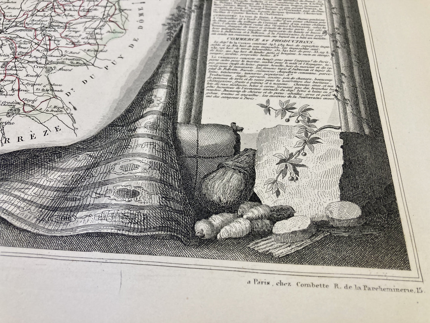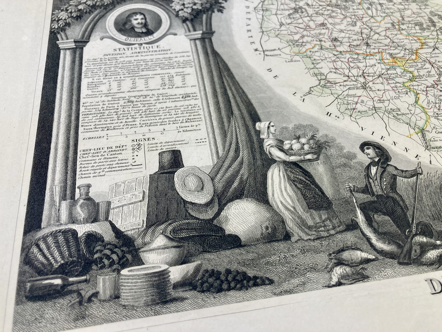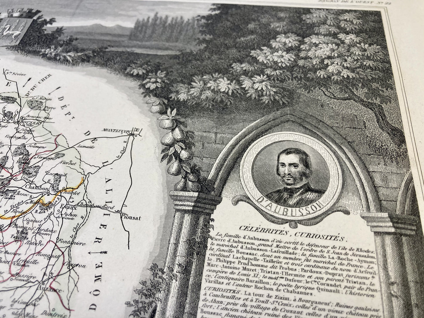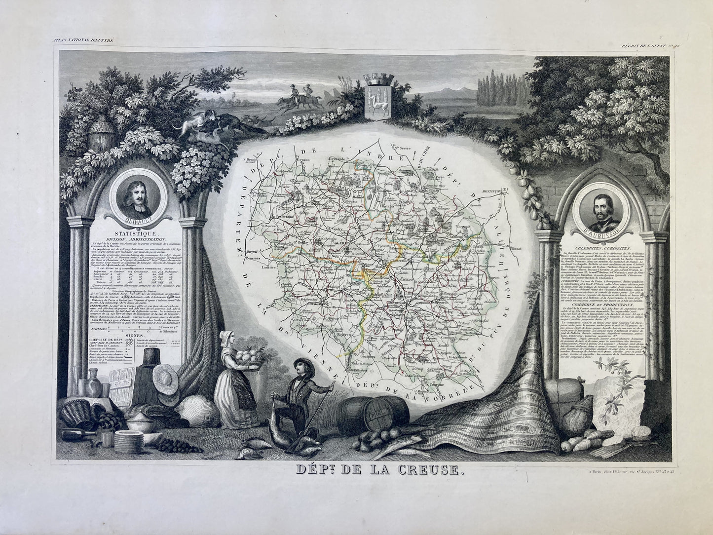 This antique map of Creuse is decorated with illustrations representing its specialties and some statistical, historical and economic information. It comes from the Illustrated National Atlas and was produced by the Geographer Victor Levasseur between 1842 and 1872. Its size is 53x36cm (to the nearest 2cm). We find on this map the towns and villages of Creuse at the time.