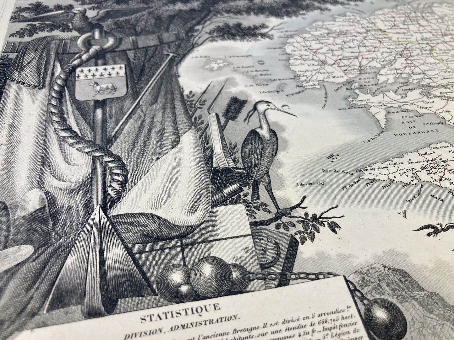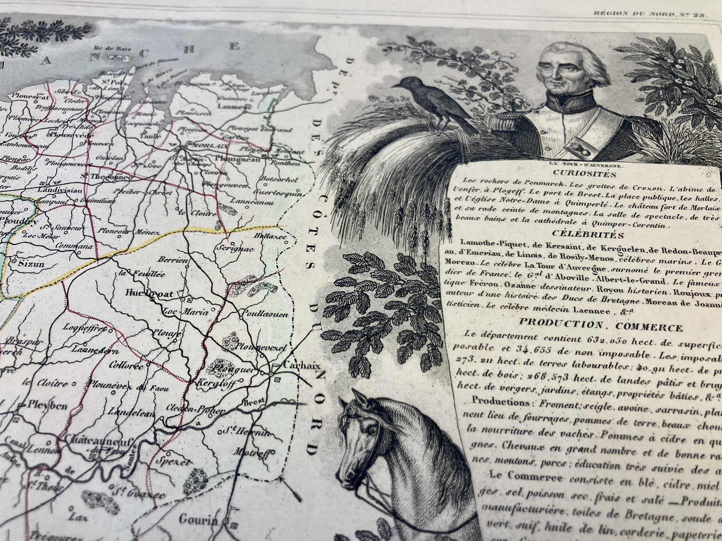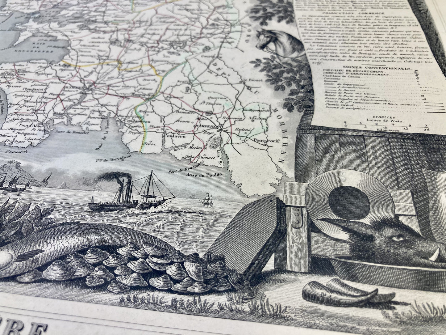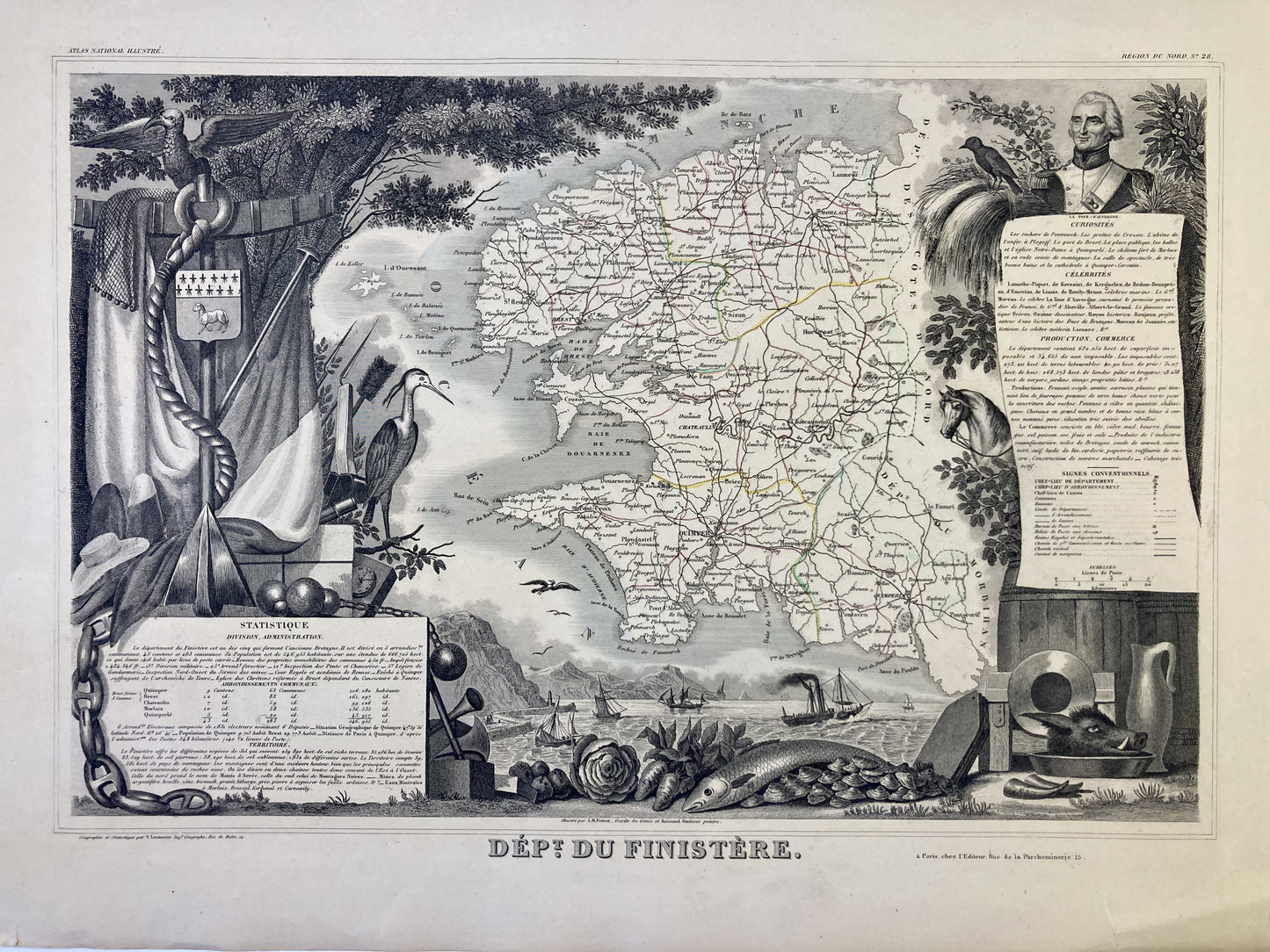 This antique map of Finistère is decorated with illustrations representing its specialties and some statistical, historical and economic information. It comes from the Illustrated National Atlas and was produced by the Geographer Victor Levasseur between 1842 and 1872. Its size is 53x36cm (to the nearest 2cm). We find on this map the towns and villages of Finistère of the time.