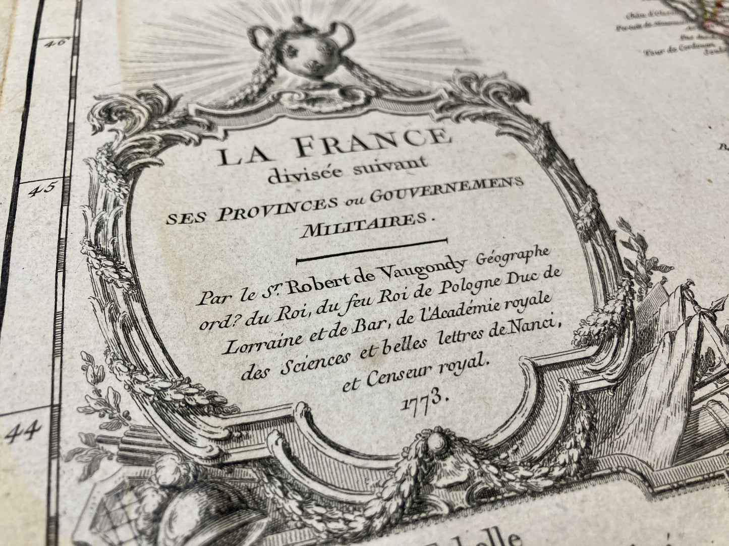 This antique map representing France in its entire extent was carried out by the cartographer Robert de Vaugondy. It is dated 1773 and its size is 76.5x54.5cm.