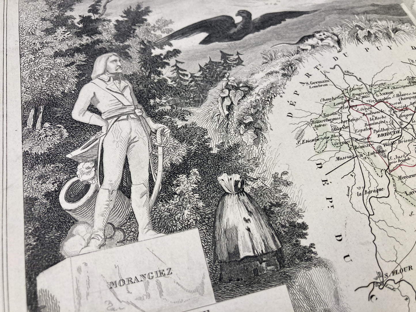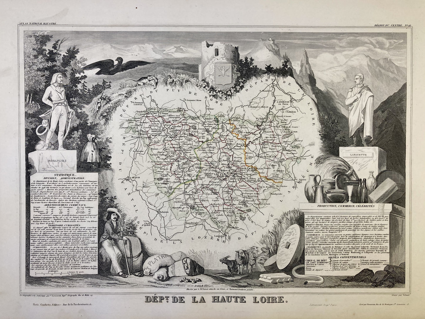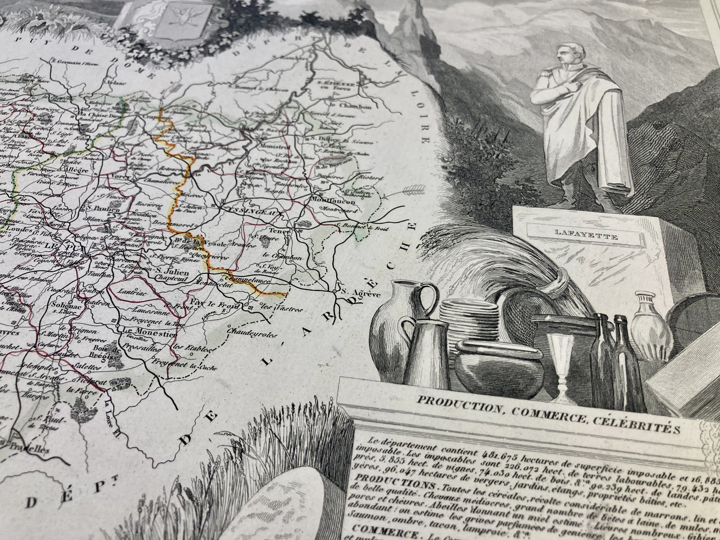 This antique map of Haute-Loire is decorated with illustrations representing its specialties and some statistical, historical and economic information. It comes from the Illustrated National Atlas and was produced by the Geographer Victor Levasseur between 1842 and 1872. Its size is 53x36cm (to the nearest 2cm). We find on this map the towns and villages of Haute-Loire at the time.