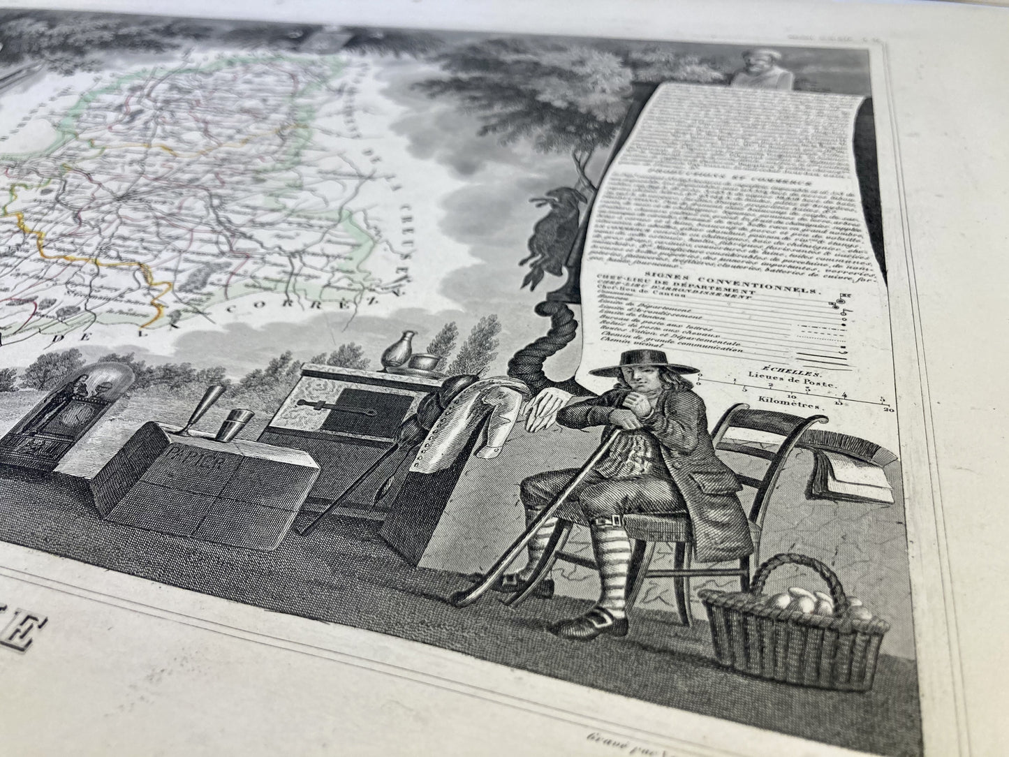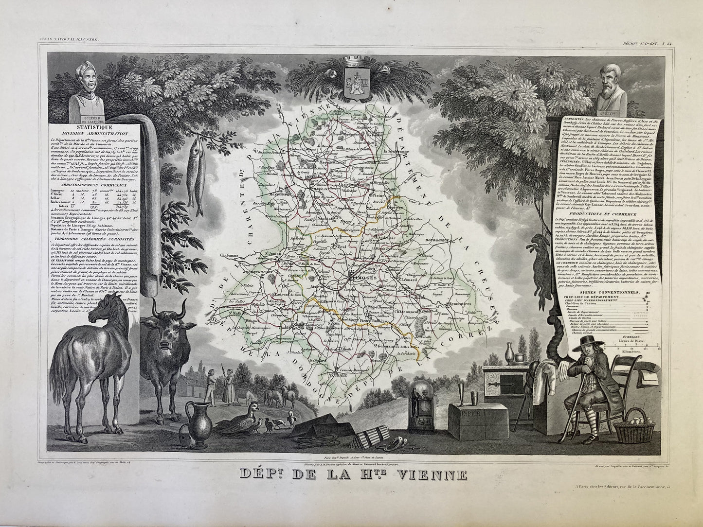 This antique map of Haute-Vienne is decorated with illustrations representing its specialties and some statistical, historical and economic information. It comes from the Illustrated National Atlas and was produced by the Geographer Victor Levasseur between 1842 and 1872. Its size is 53x36cm (to the nearest 2cm). We find on this map the towns and villages of Haute-Vienne of the time.