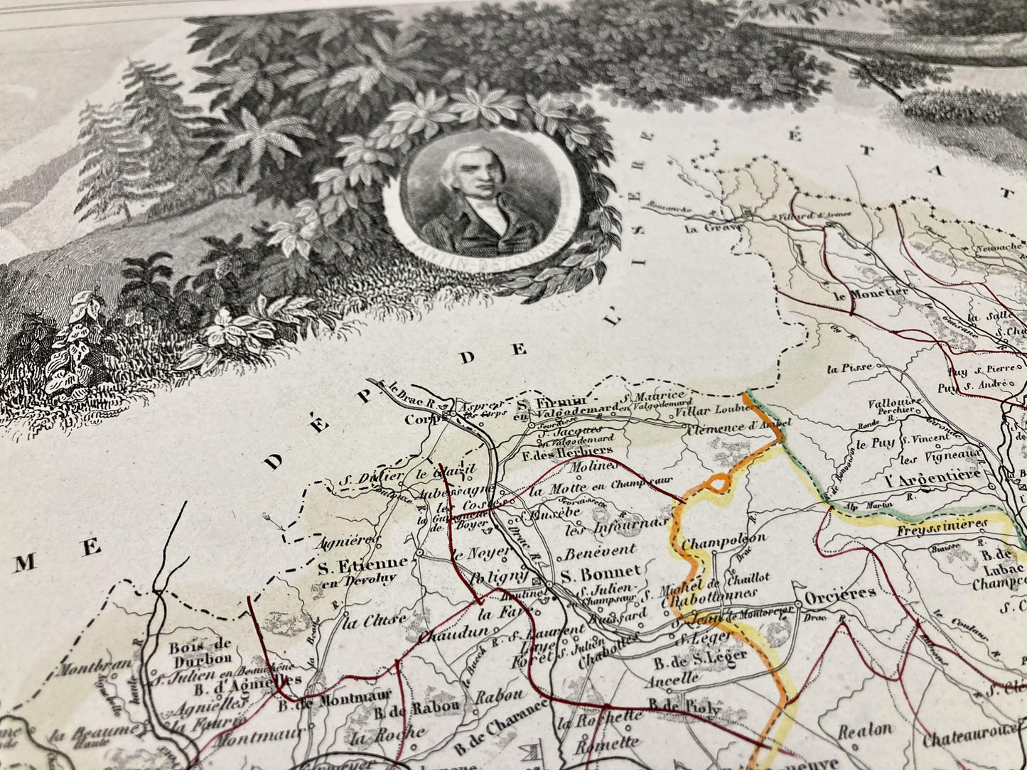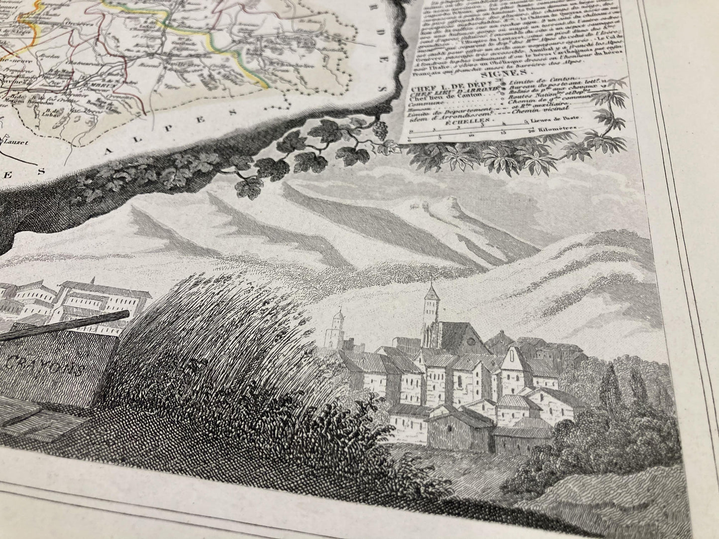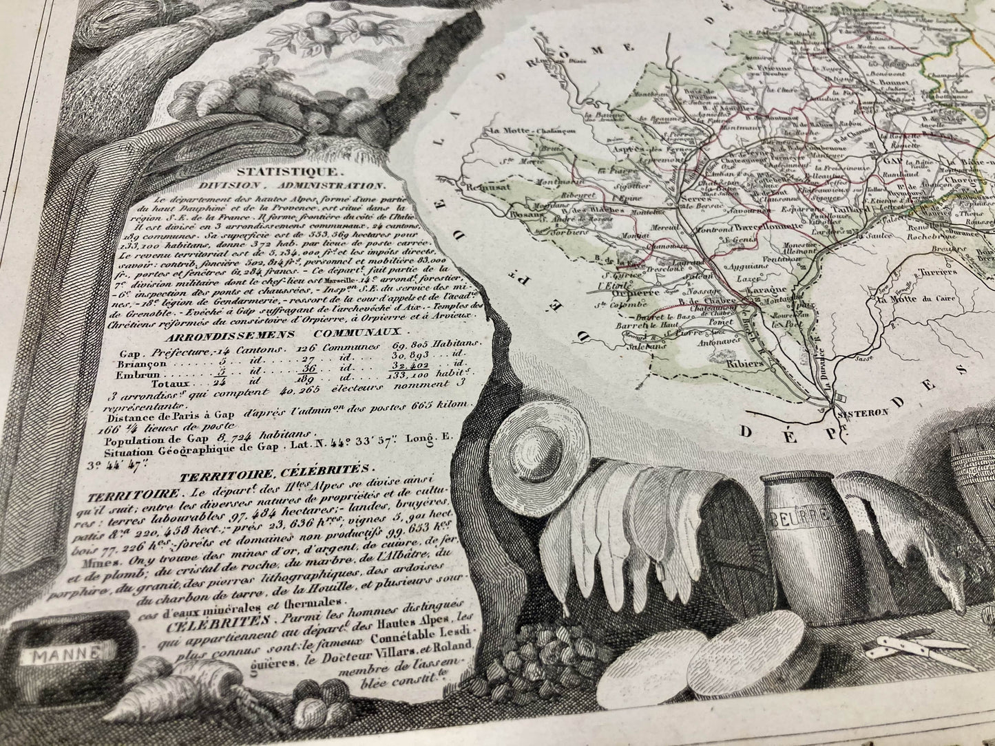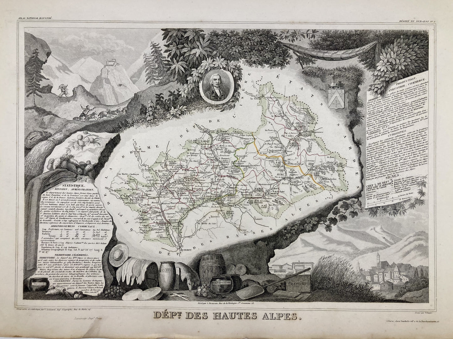 This antique map of the Hautes-Alpes is decorated with illustrations representing its specialties and some statistical, historical and economic information. It comes from the Illustrated National Atlas and was produced by the Geographer Victor Levasseur between 1842 and 1872. Its size is 53x36cm (to the nearest 2cm). We find on this map the towns and villages of the Hautes-Alpes of the time.