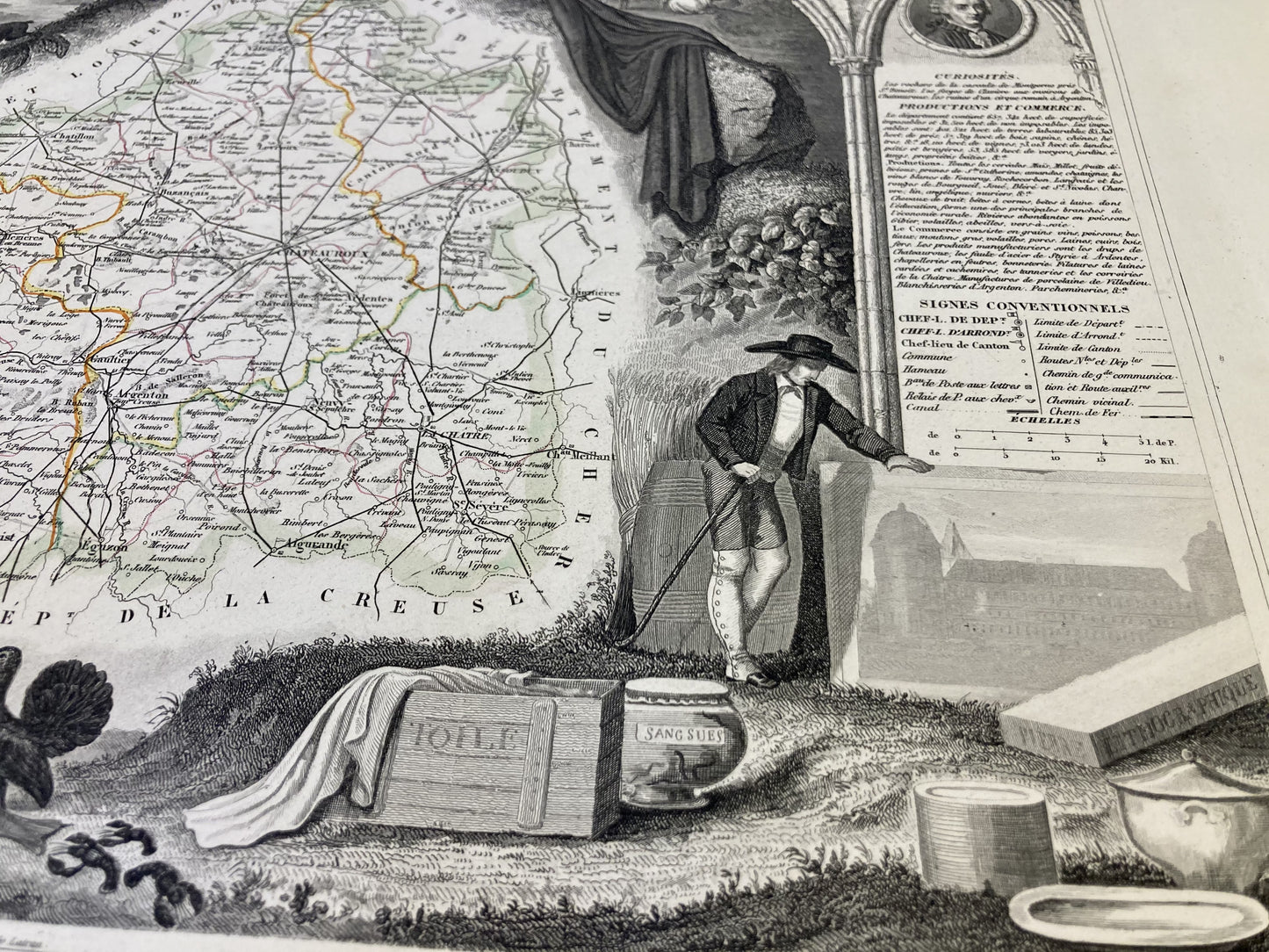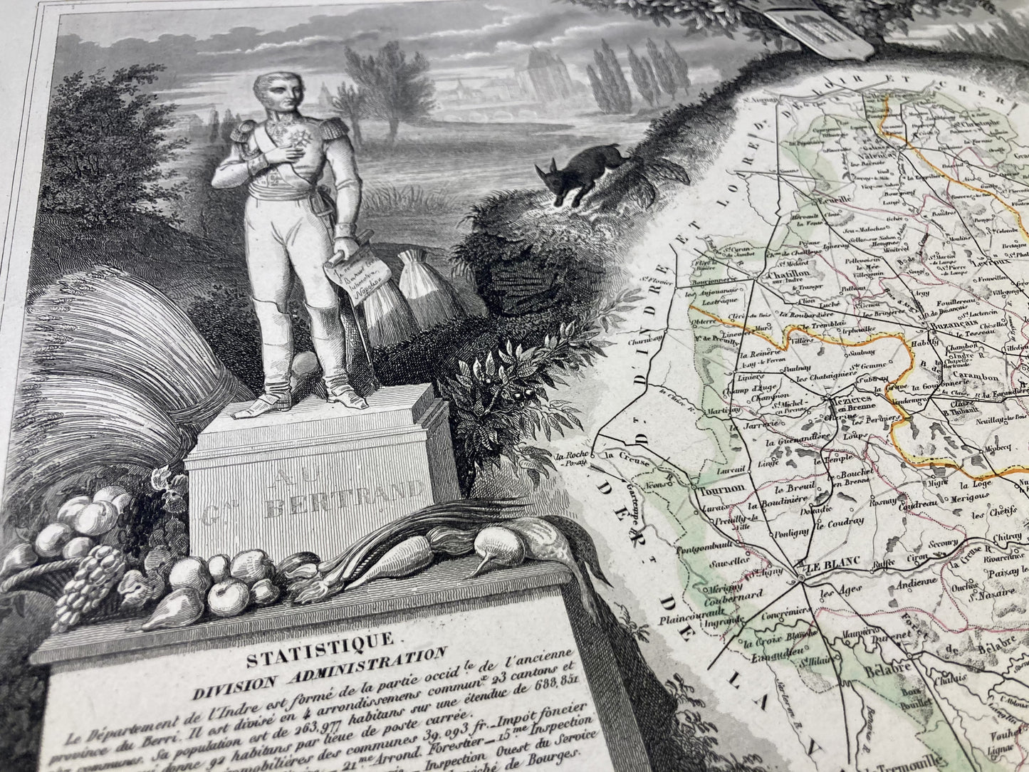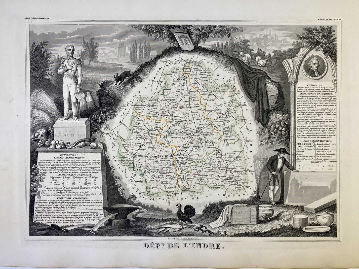 This antique map of Indre is decorated with illustrations representing its specialties and some statistical, historical and economic information. It comes from the Illustrated National Atlas and was produced by the Geographer Victor Levasseur between 1842 and 1872. Its size is 53x36cm (to the nearest 2cm). We find on this map the towns and villages of Indre of the time.