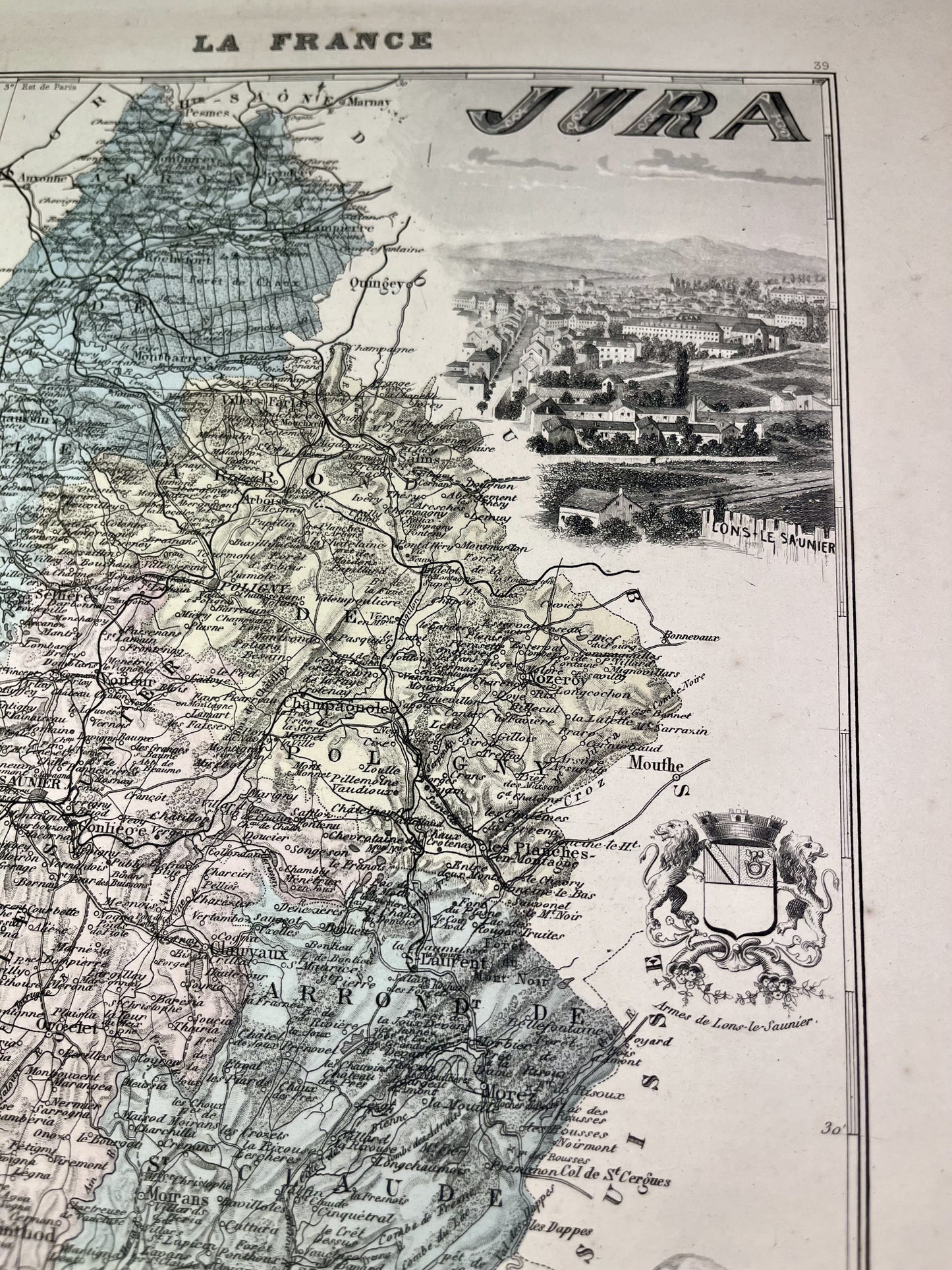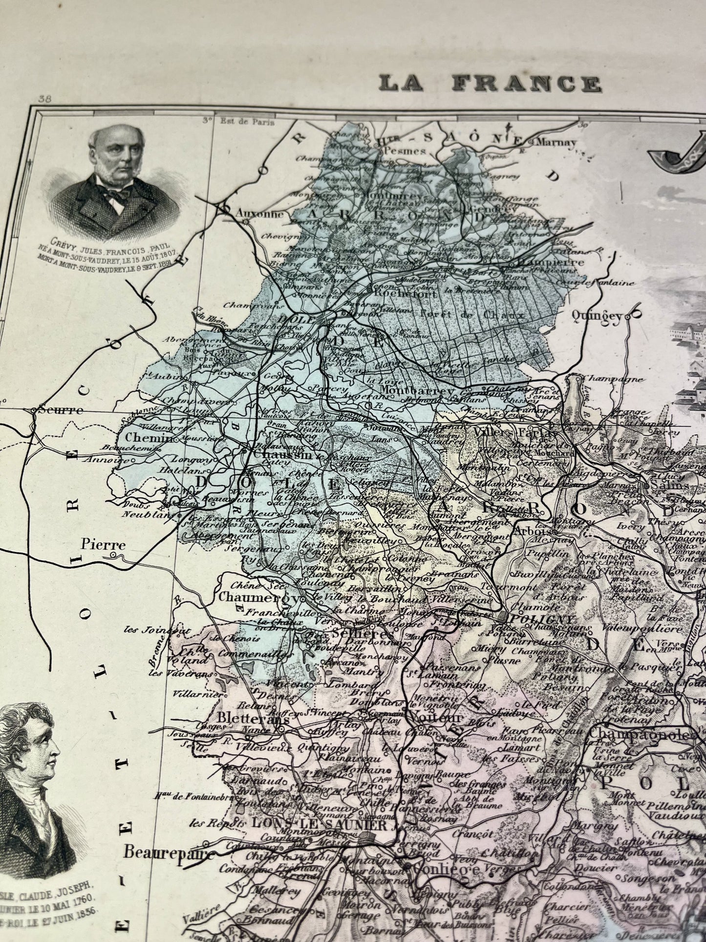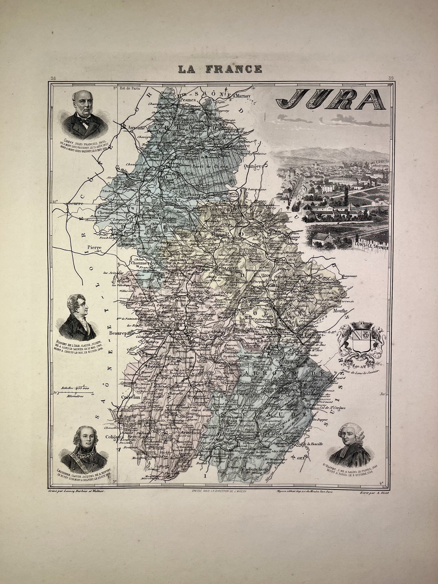 This old map of the Jura is colored and decorated with illustrations representing famous people from the department as well as a view of the town of Lons-le-Saunier. It comes from the Nouvel Atlas National Illustré, a work published during the end of the 19th century and the beginning of the 20th, and was produced by the geographers A. Vuillemin, L. Thuillier, Ch. Lacoste and G. Lorsignol. Its size is 39x29cm. We find on this map the towns and villages of the Jura of the time.