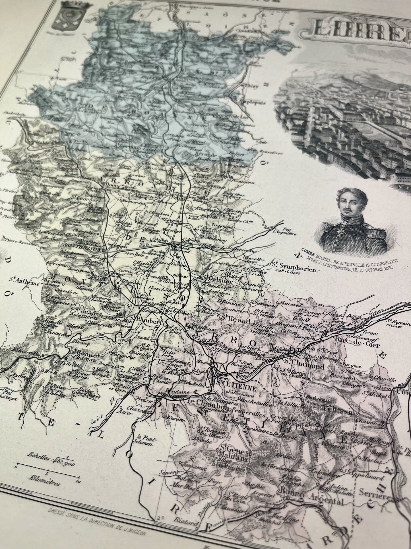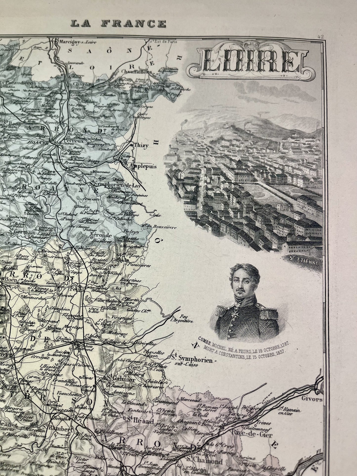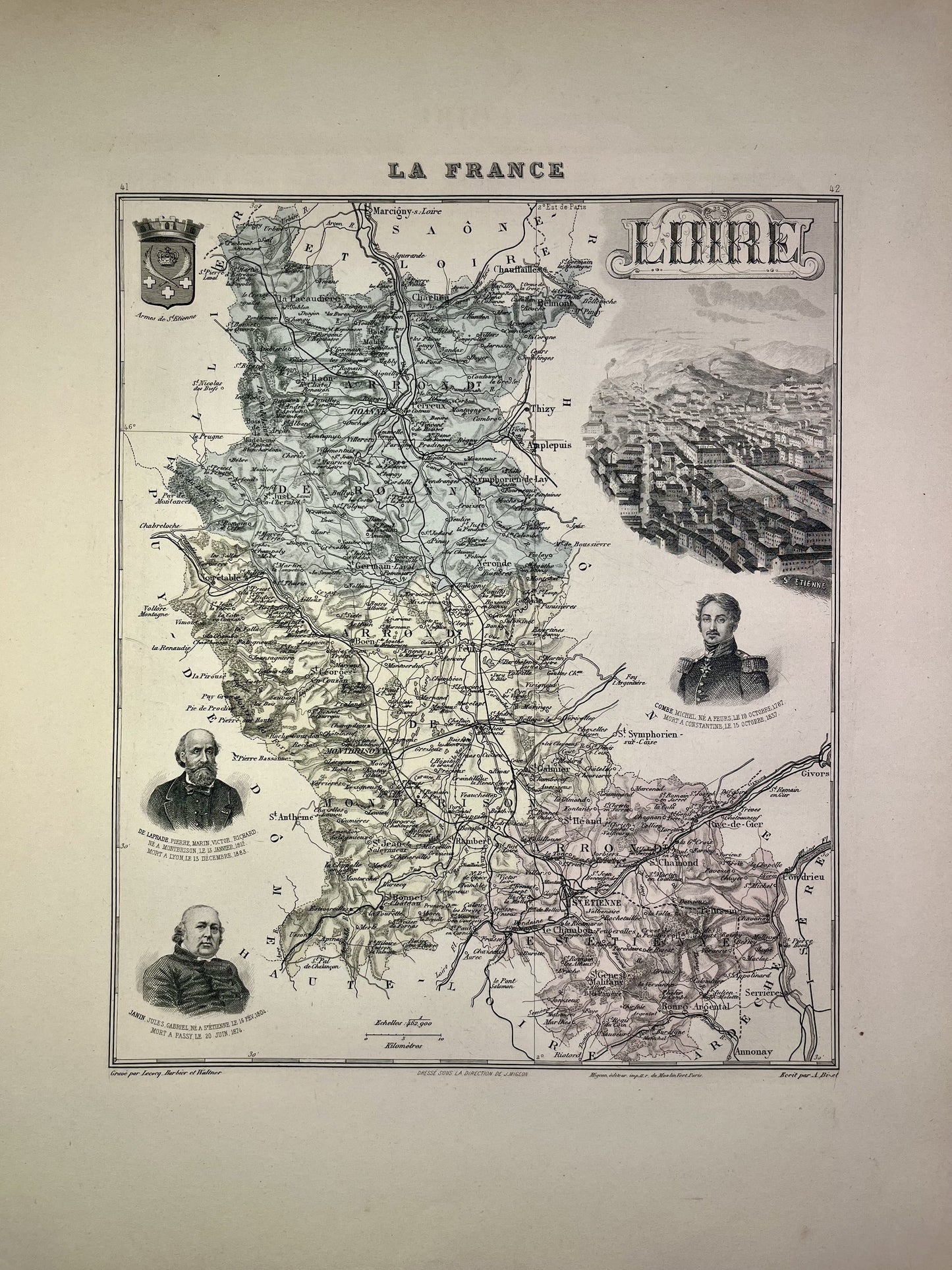 This old map of the Loire is colored and decorated with illustrations representing famous people from the department as well as a view of the town of Saint-Etienne. It comes from the Nouvel Atlas National Illustré, a work published during the end of the 19th century and the beginning of the 20th, and was produced by the geographers A. Vuillemin, L. Thuillier, Ch. Lacoste and G. Lorsignol. Its size is 39x29cm. We find on this map the towns and villages of the Loire of the time.