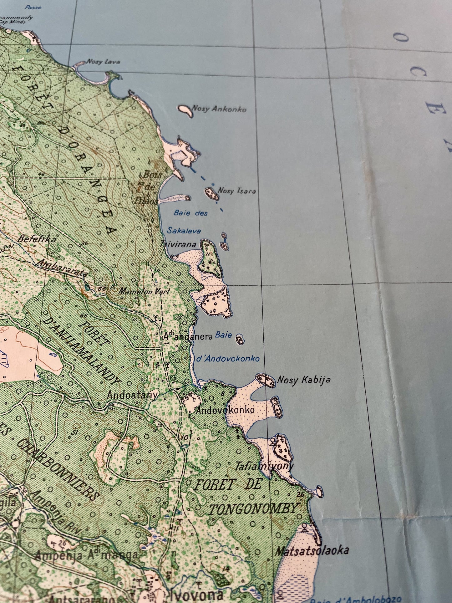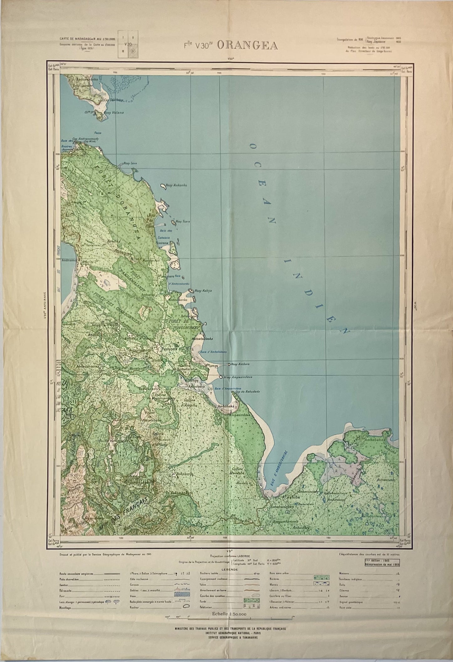 This ancient map of Madagascar, an island off the coast of Africa, depicts the coastal region of Orangea. It was carried out by the Geographical Service of Madagascar in 1960 and its size is 63x43cm.