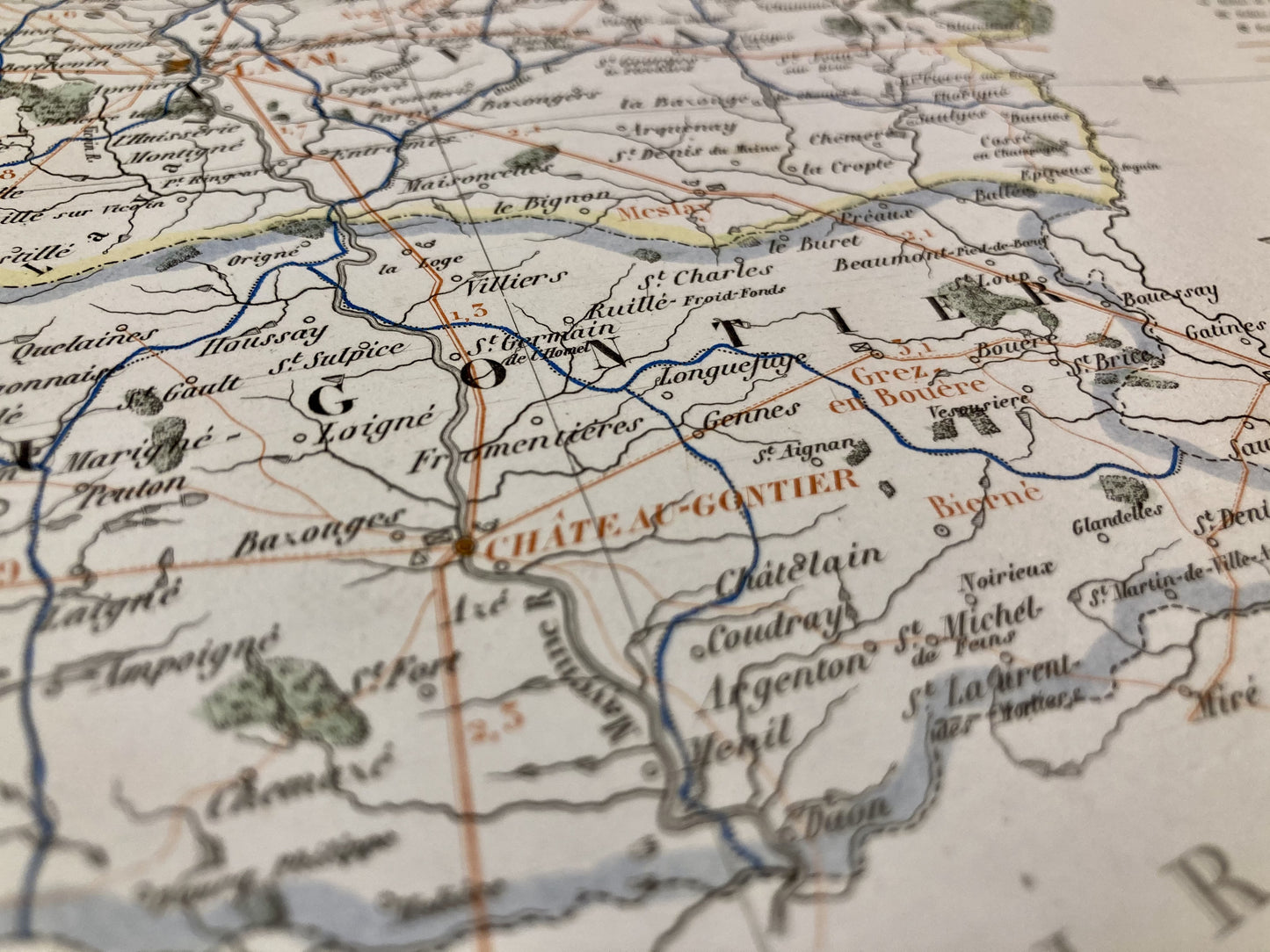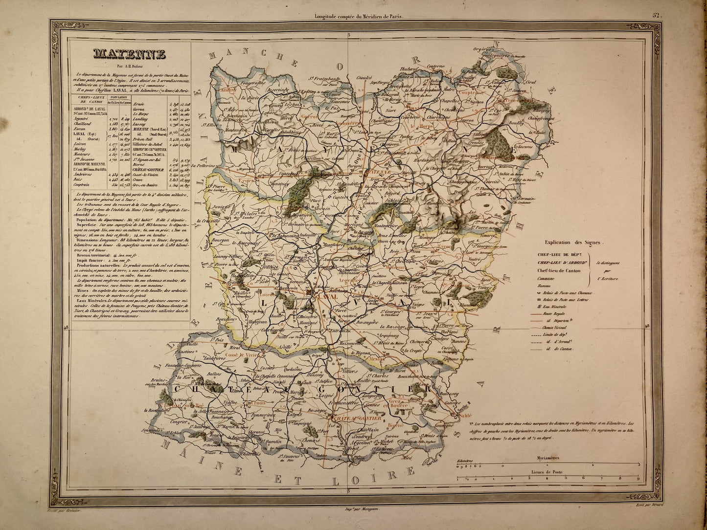 This old map of Mayenne accompanied by some statistics comes from the Atlas of the 86 departments and the French Colonies. It was produced by the Geographer Auguste-Henri Dufour and printed during the 19th century. Its size is 41x32cm.