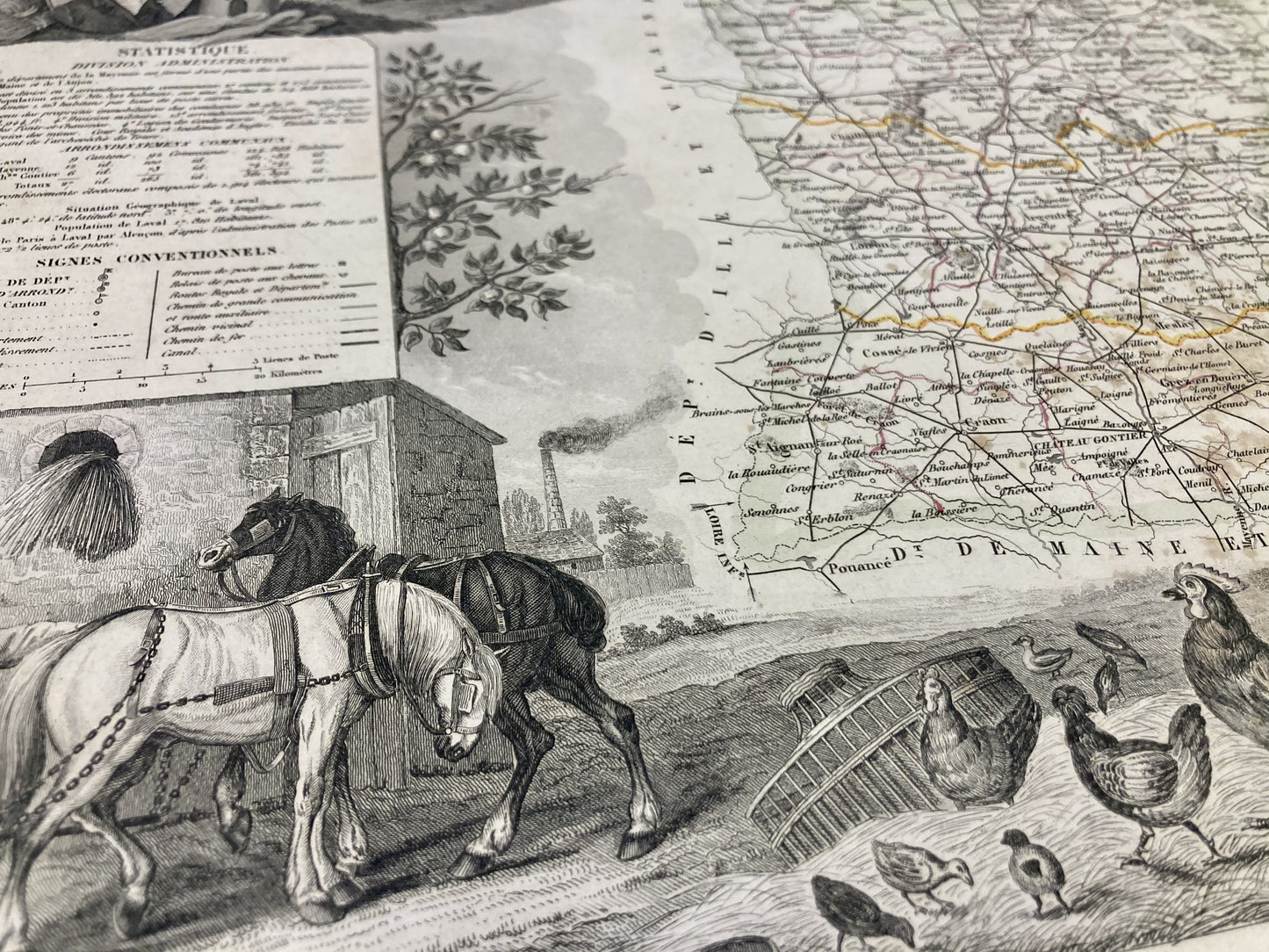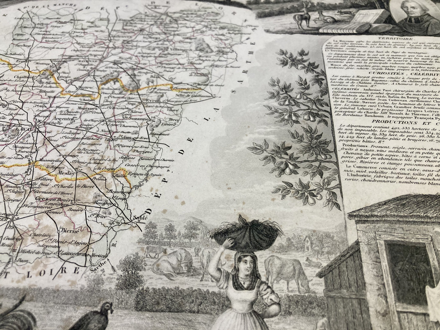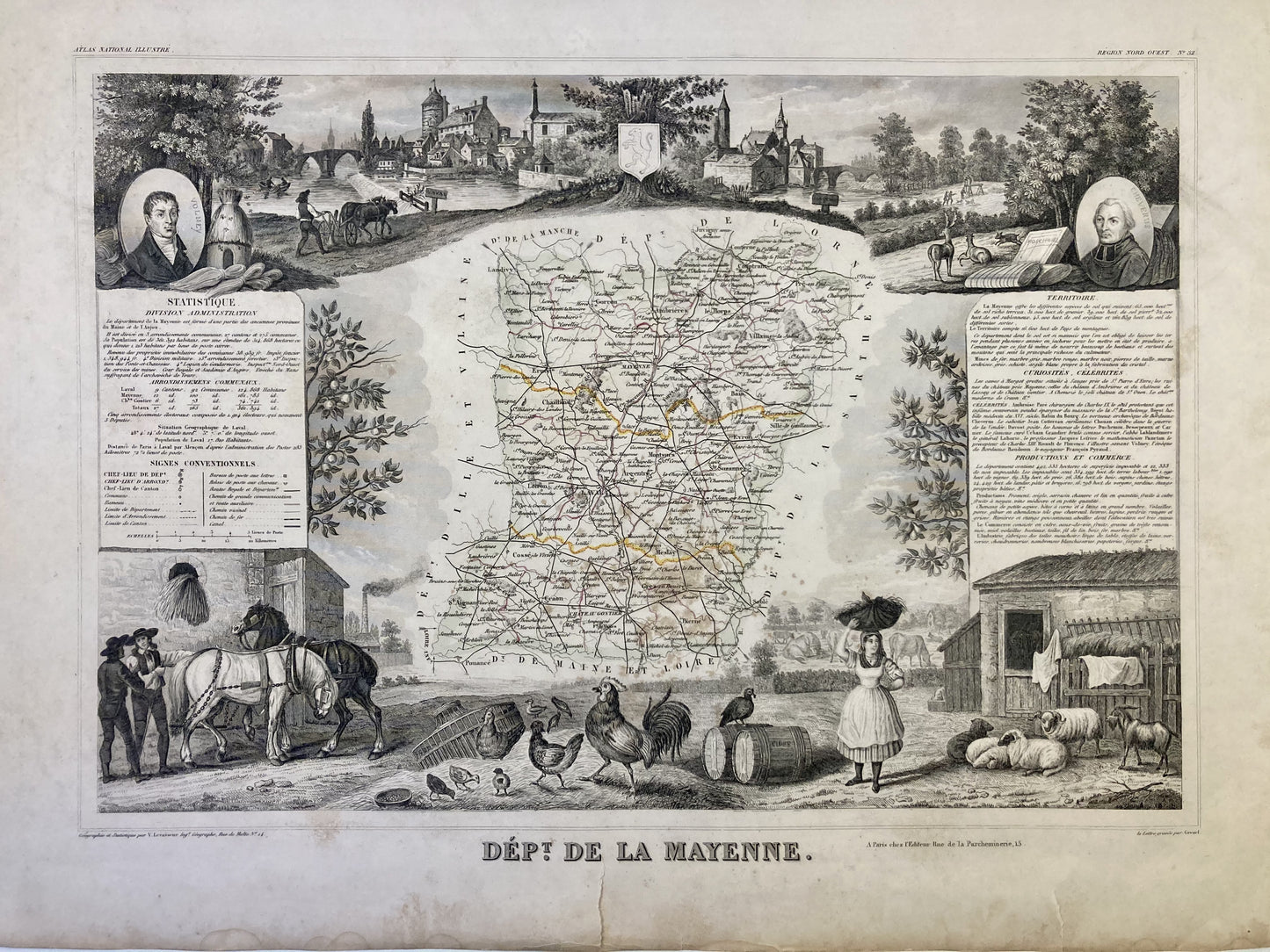 This antique map of Mayenne is decorated with illustrations representing its specialties and some statistical, historical and economic information. It comes from the Illustrated National Atlas and was produced by the Géographe Victor Levasseur between 1842 and 1872. Its dimension is 53x36cm (to the nearest 2cm). We find on this map the towns and villages of Mayenne of the time.