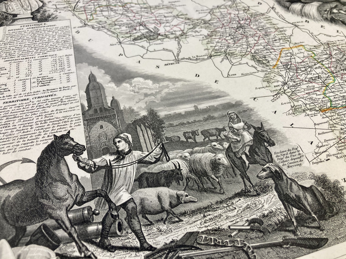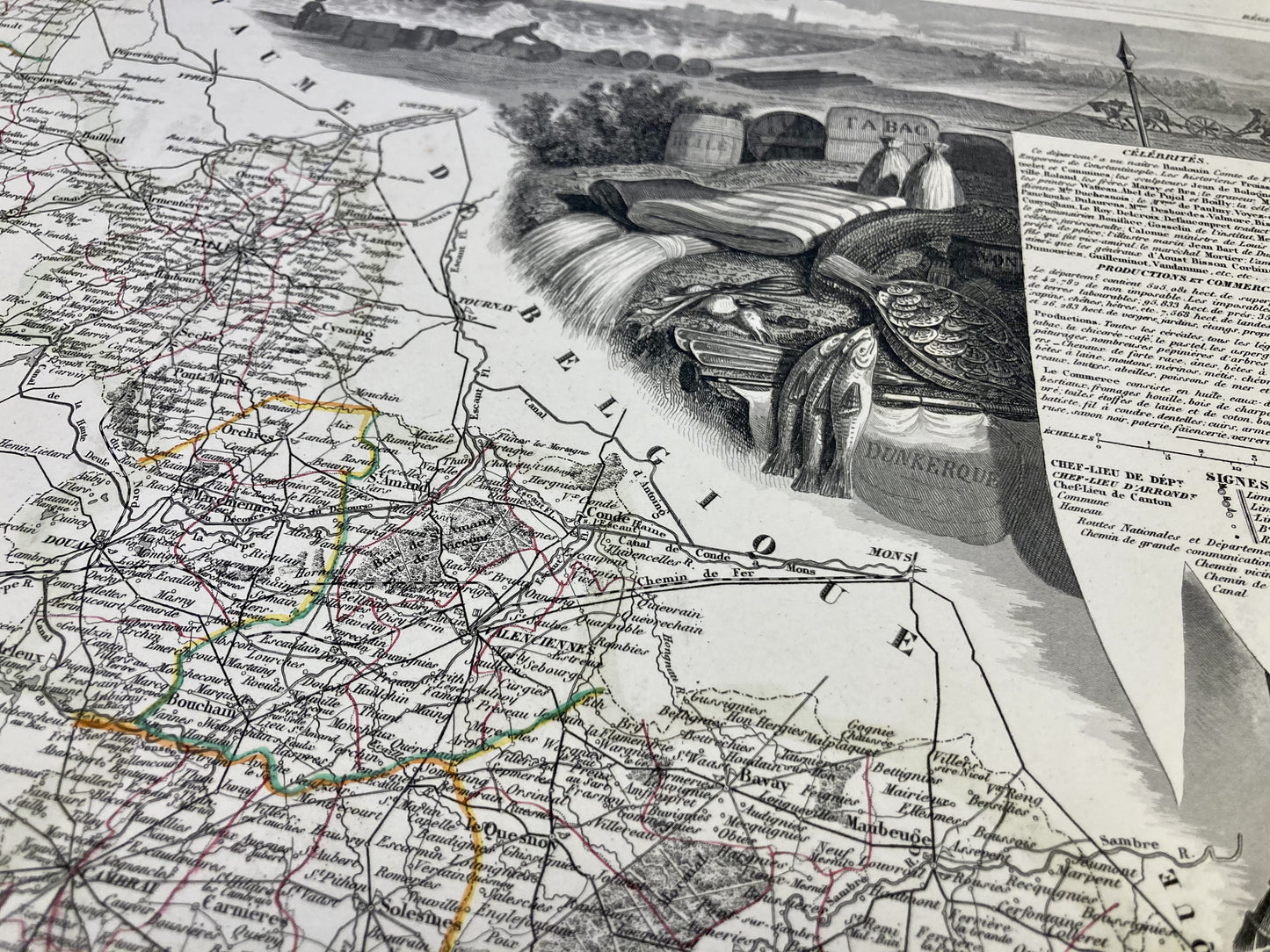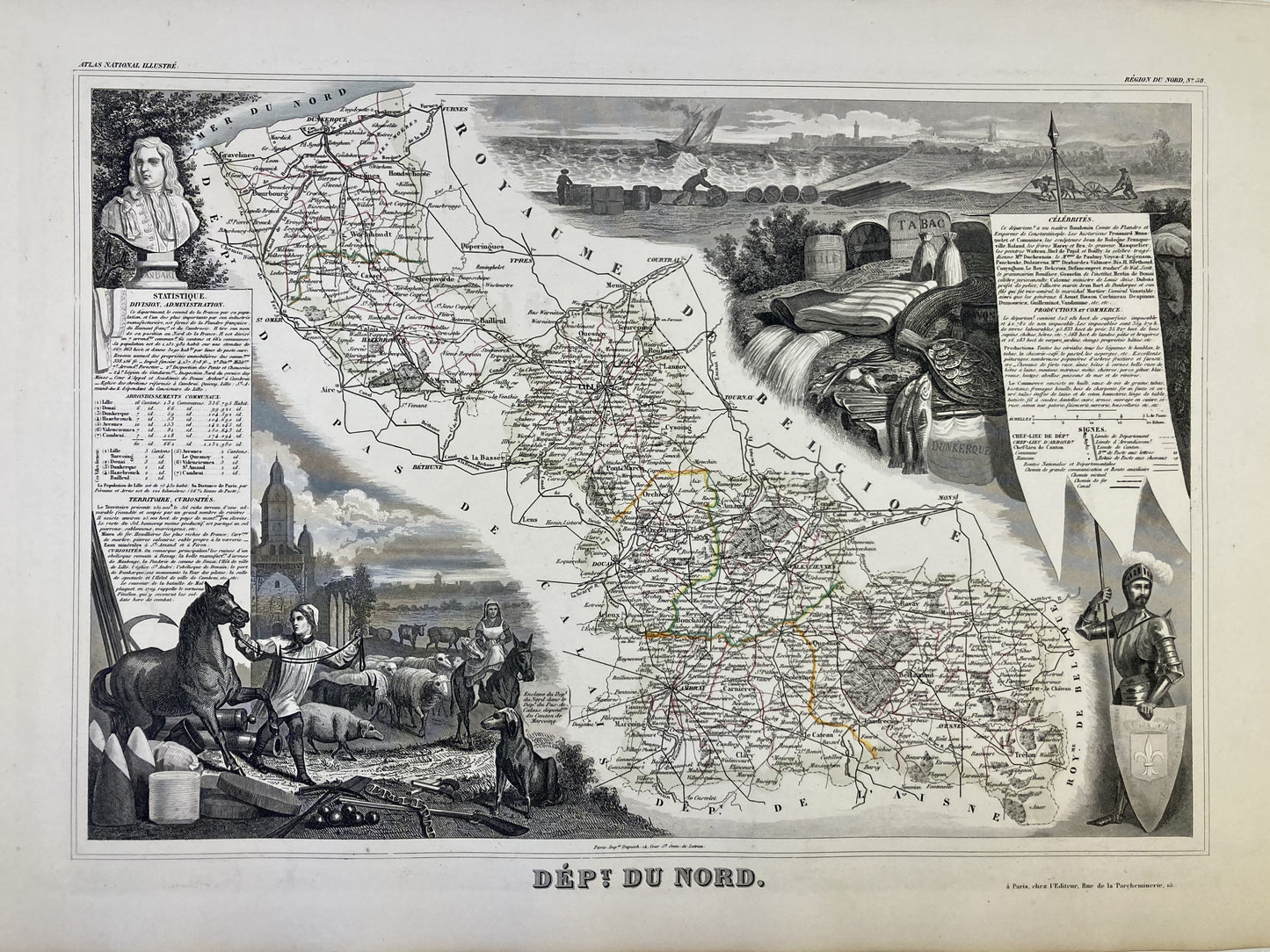 This antique map of the Nord is decorated with illustrations representing its specialties and some statistical, historical and economic information. It comes from the Illustrated National Atlas and was produced by the Geographer Victor Levasseur between 1842 and 1872. Its size is 53x36cm (to the nearest 2cm). We find on this map the towns and villages of the Nord of the time.