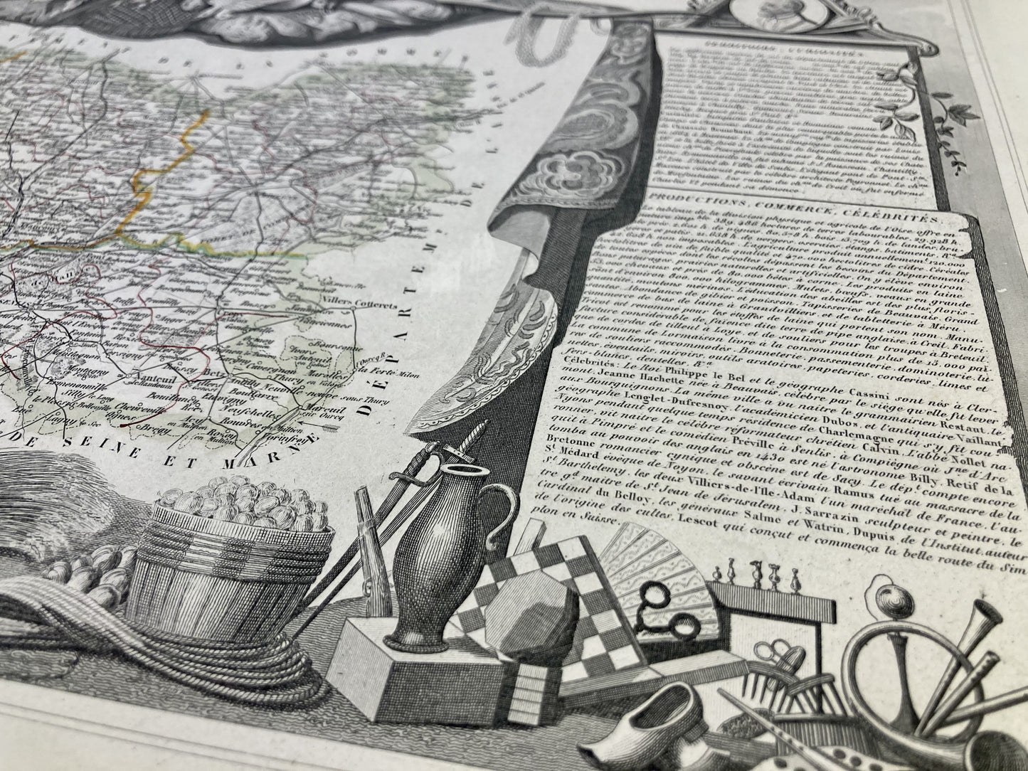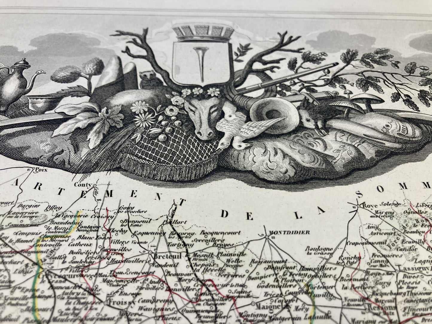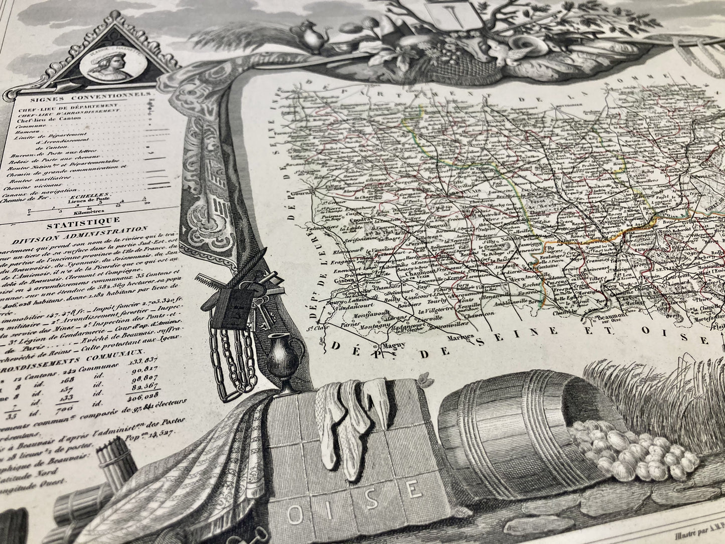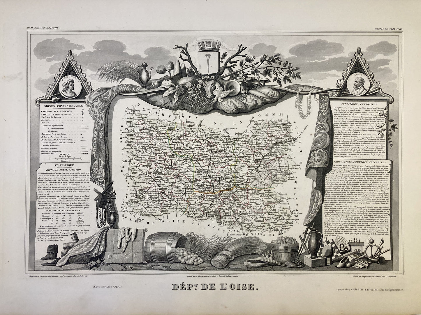 This antique map of the Oise is decorated with illustrations representing its specialties and some statistical, historical and economic information. It comes from the Illustrated National Atlas and was produced by the Geographer Victor Levasseur between 1842 and 1872. Its size is 53x36cm (to the nearest 2cm). We find on this map the towns and villages of the Oise of the time.